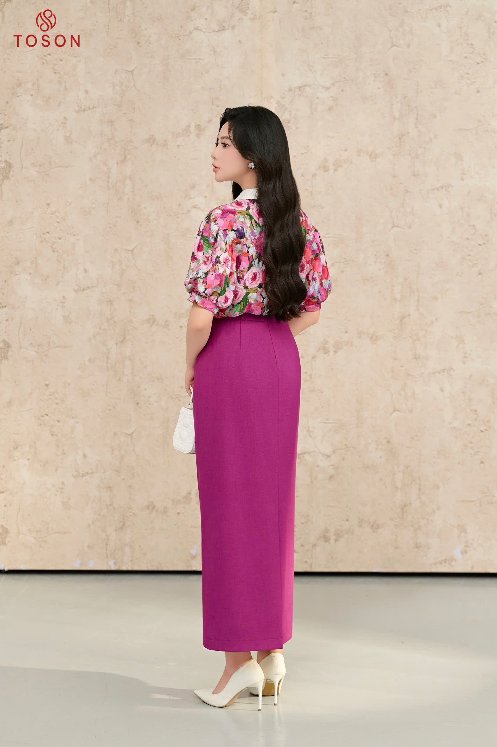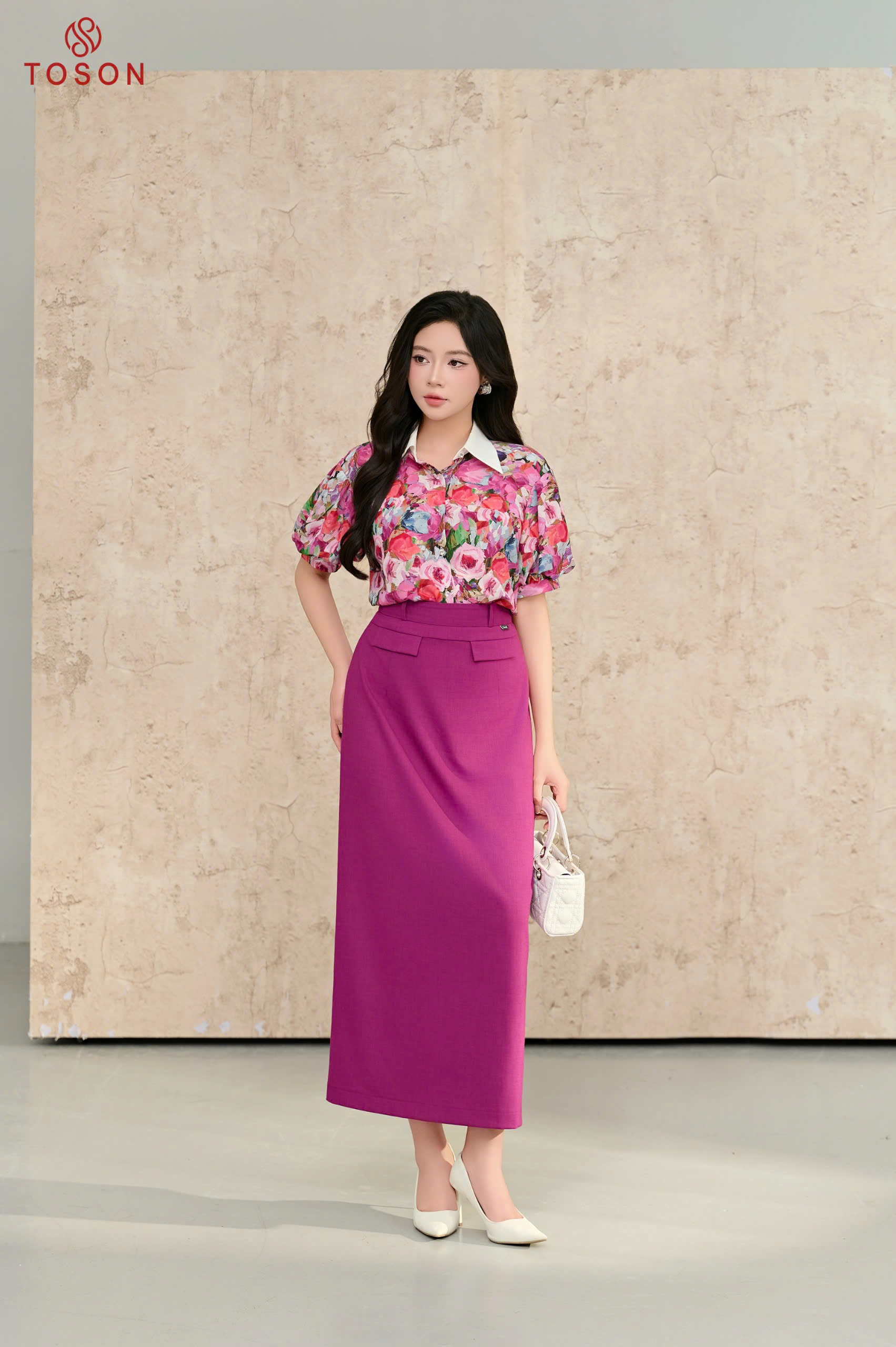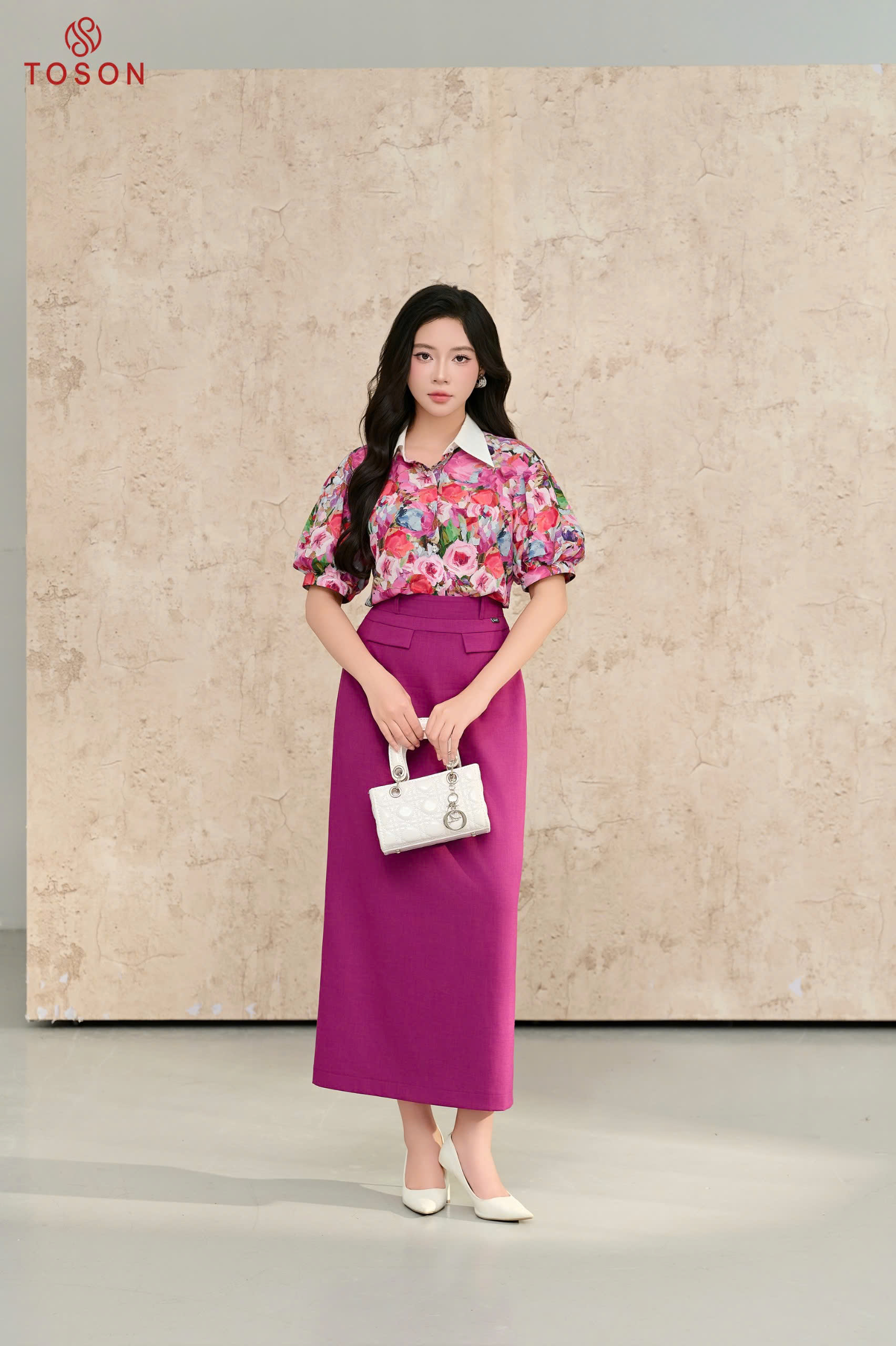 14089 - Áo lụa hoa hồng cổ xếp nơ.