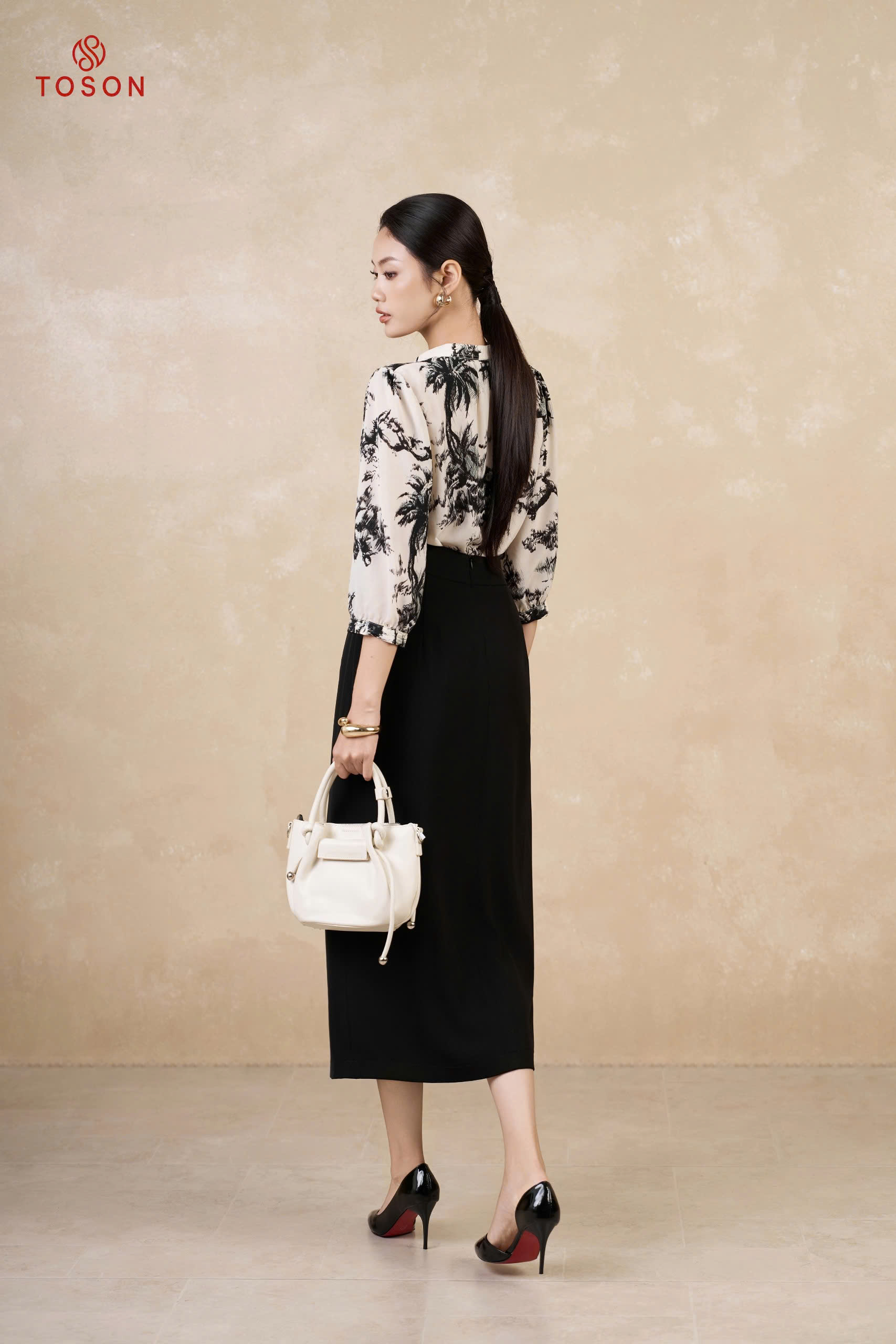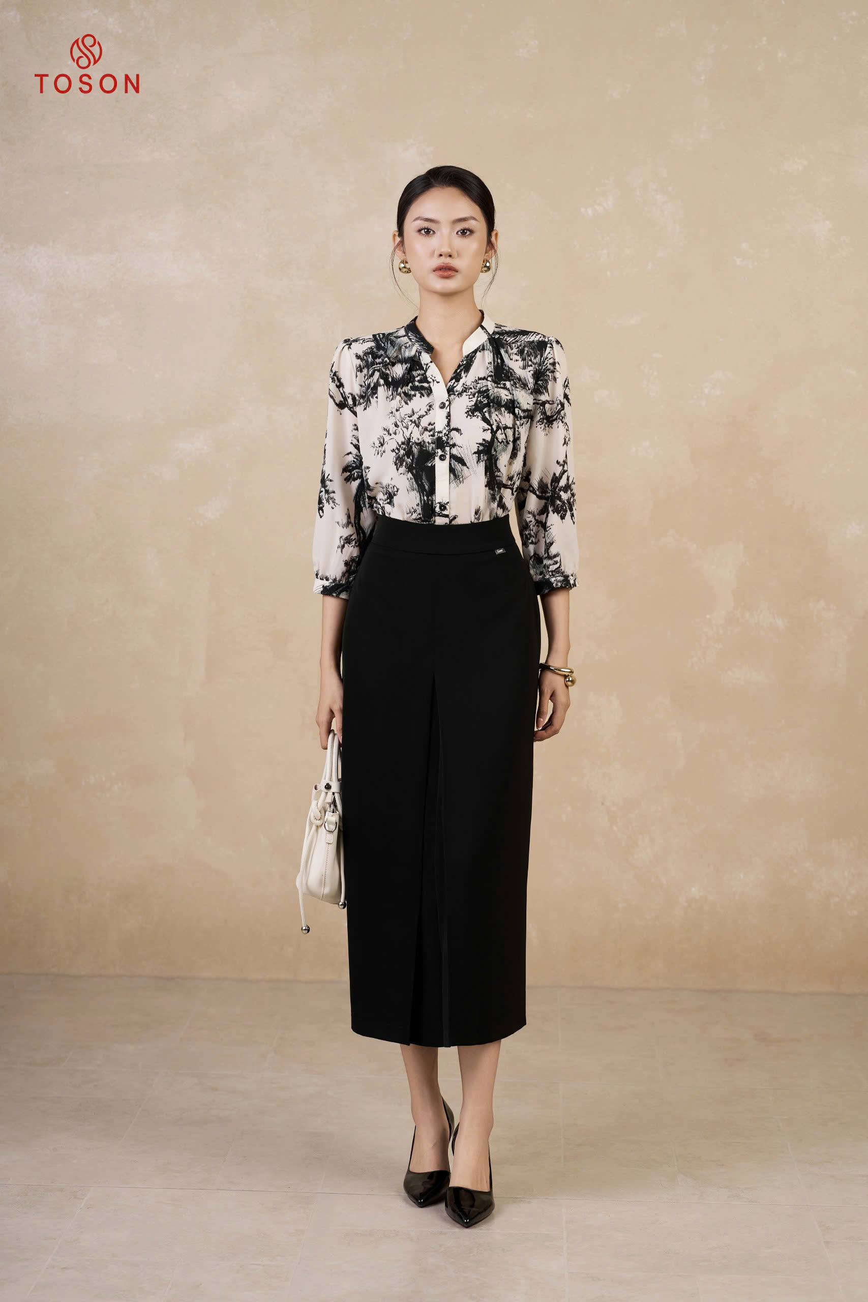 41095H85 - Đầm lụa hoa đen xếp ly thân trước