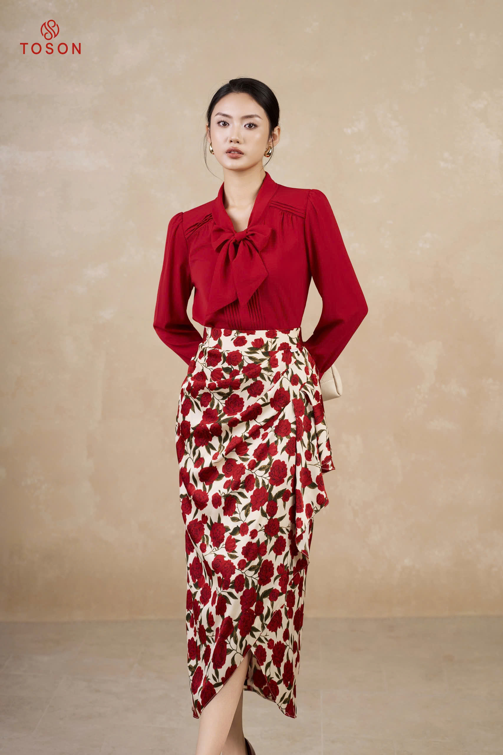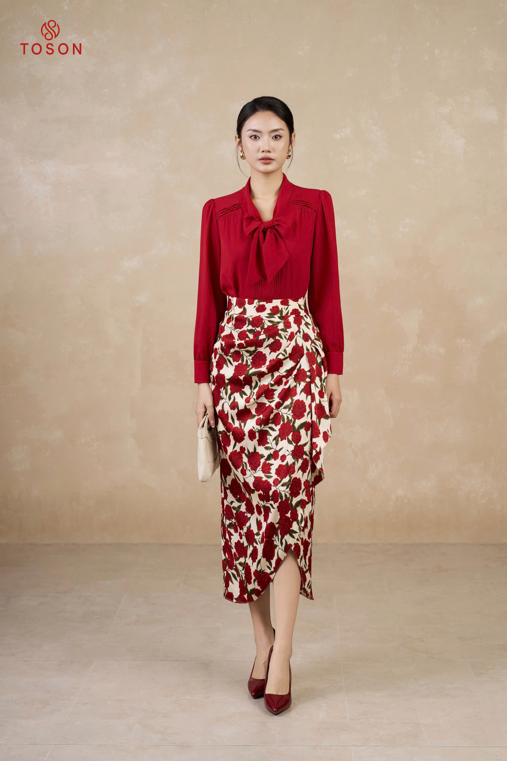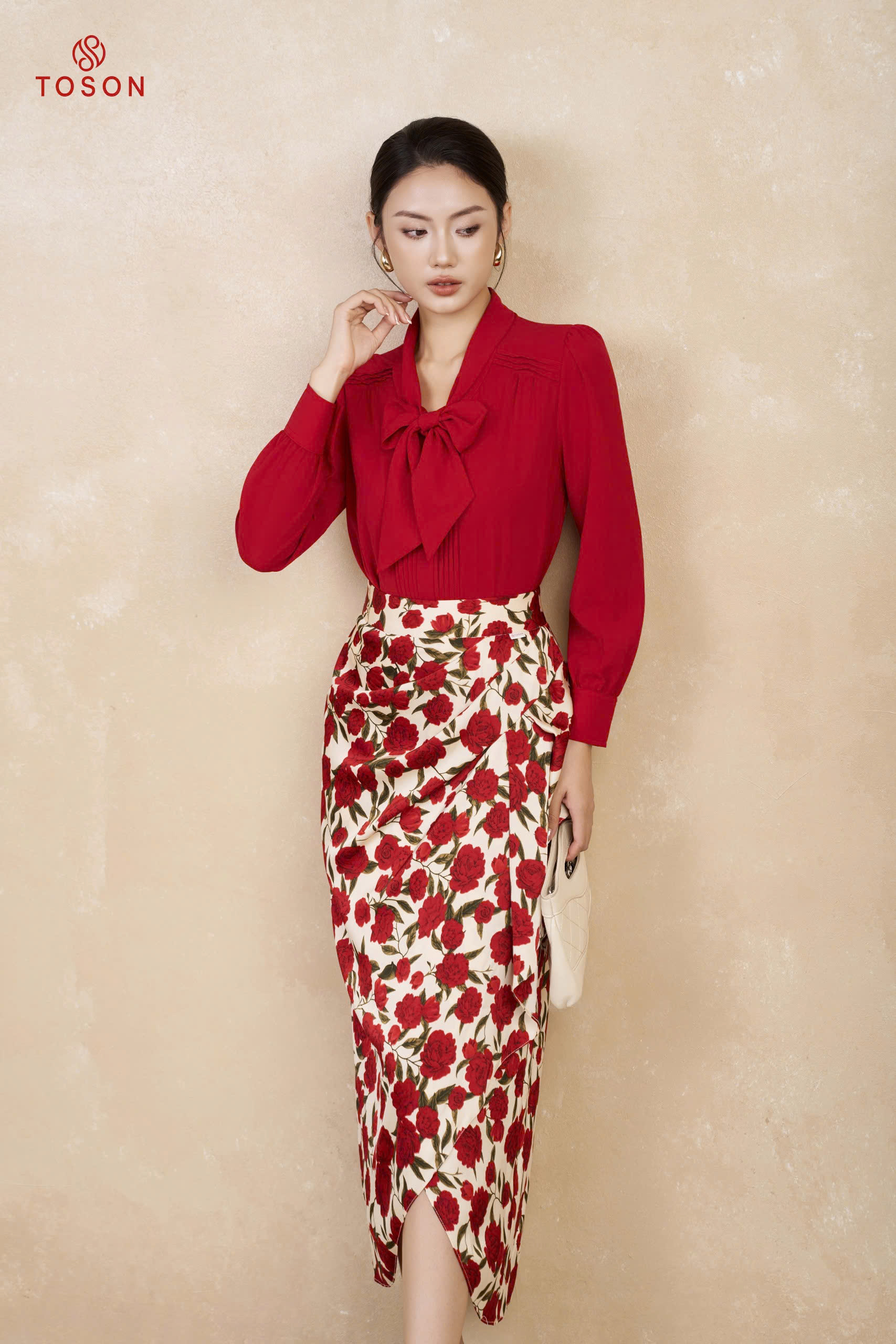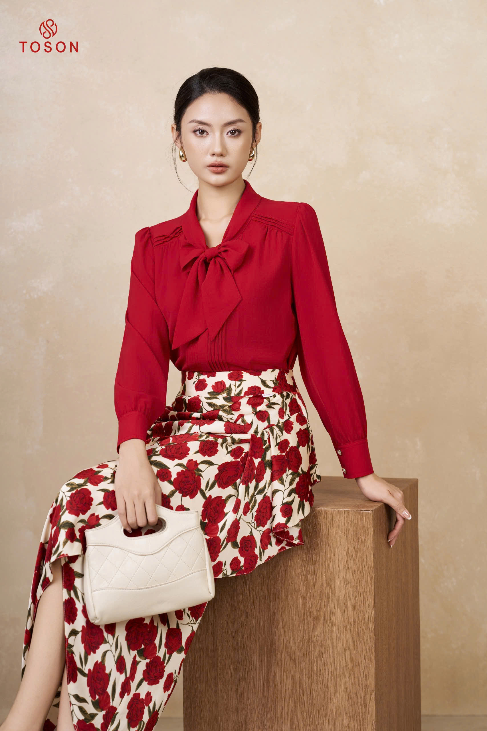 12045D35 - Áo silk đỏ dài tay cổ buộc nơ