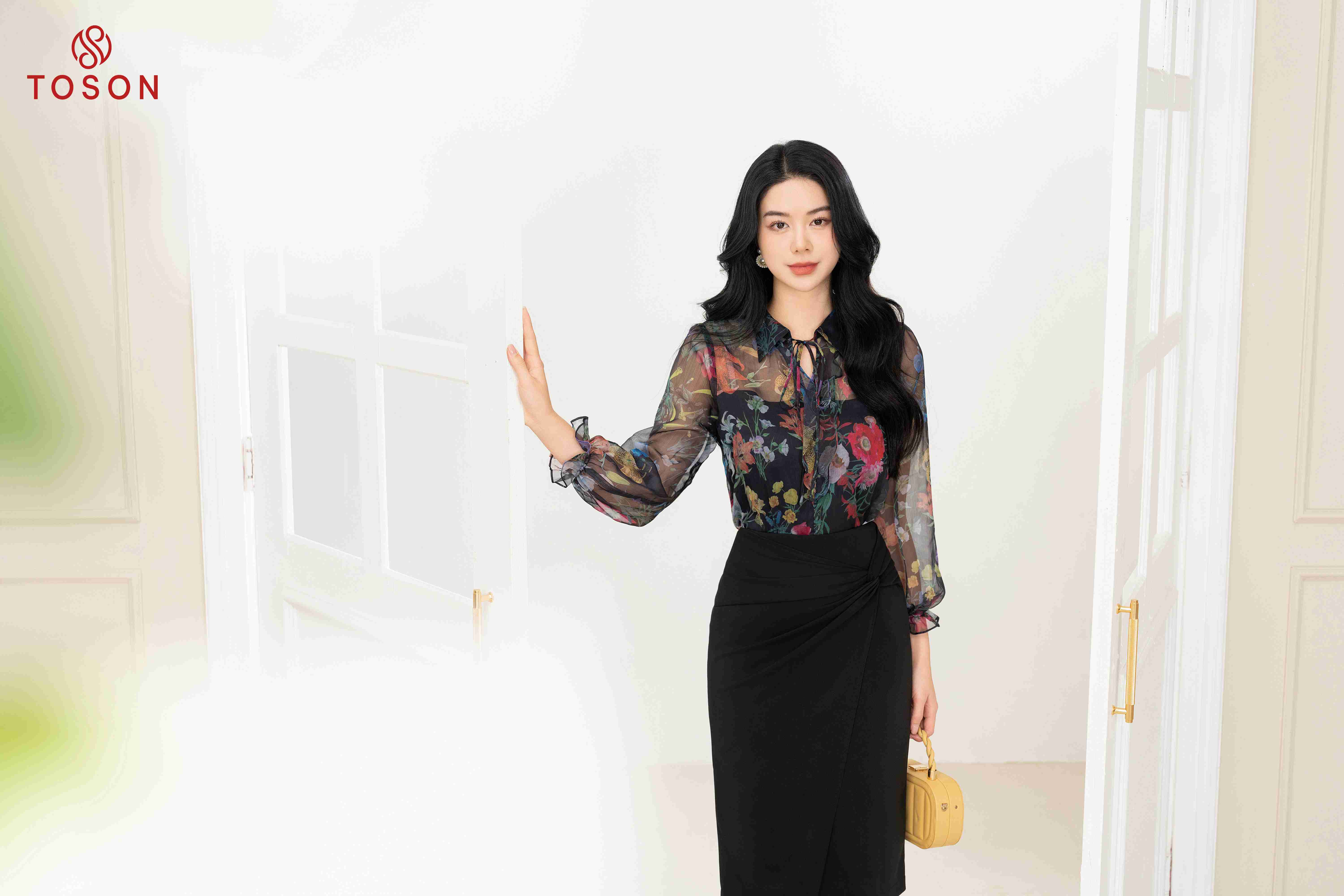 12976B93 - Áo tơ hoa họa tiết, cổ đức tay bo chun
