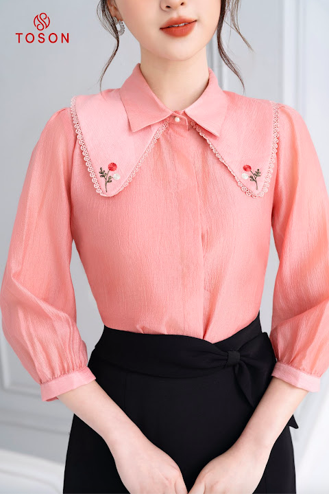 12982P84 - Áo tơ hồng, cổ đức tà bong thêu hoa