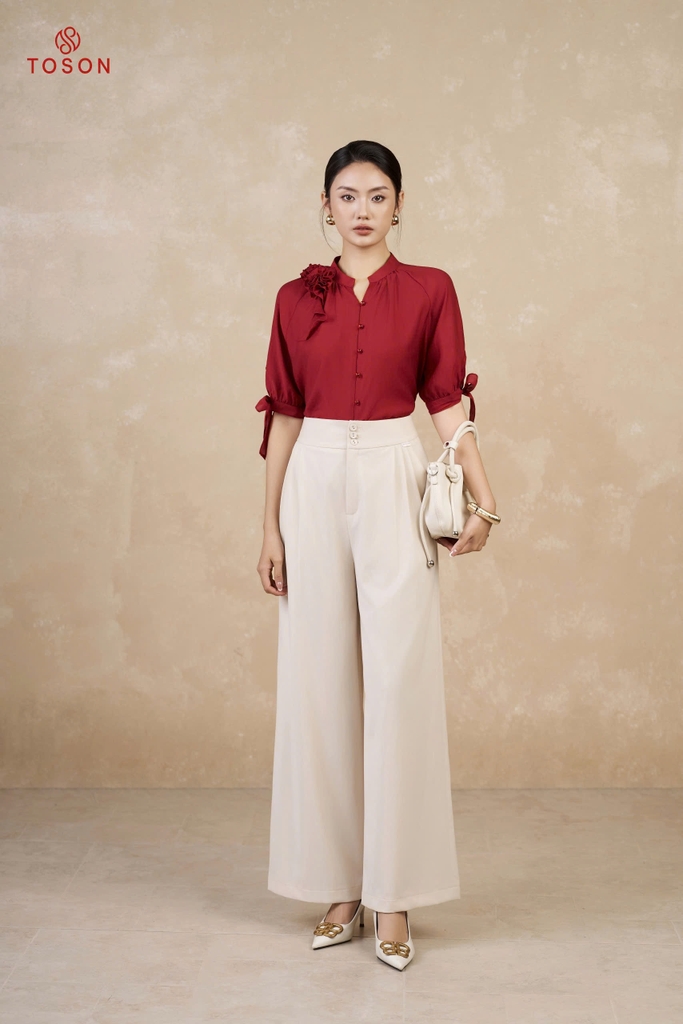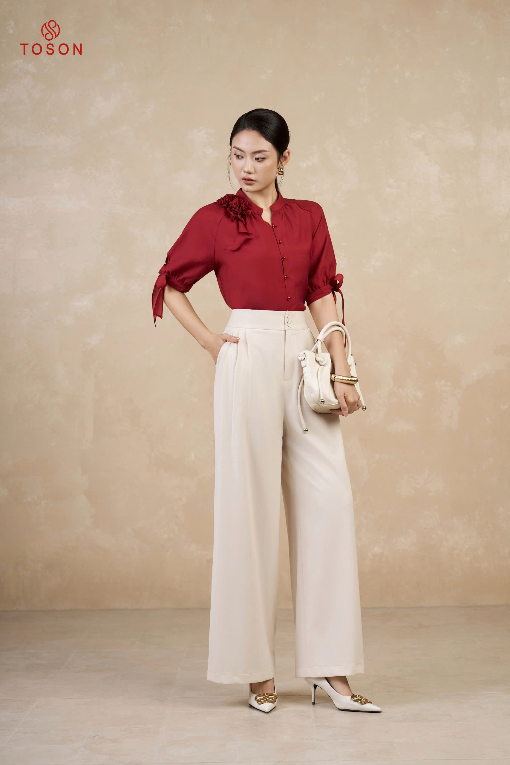 14047D95 - Áo lụa tơ đỏ, cổ đính hoa