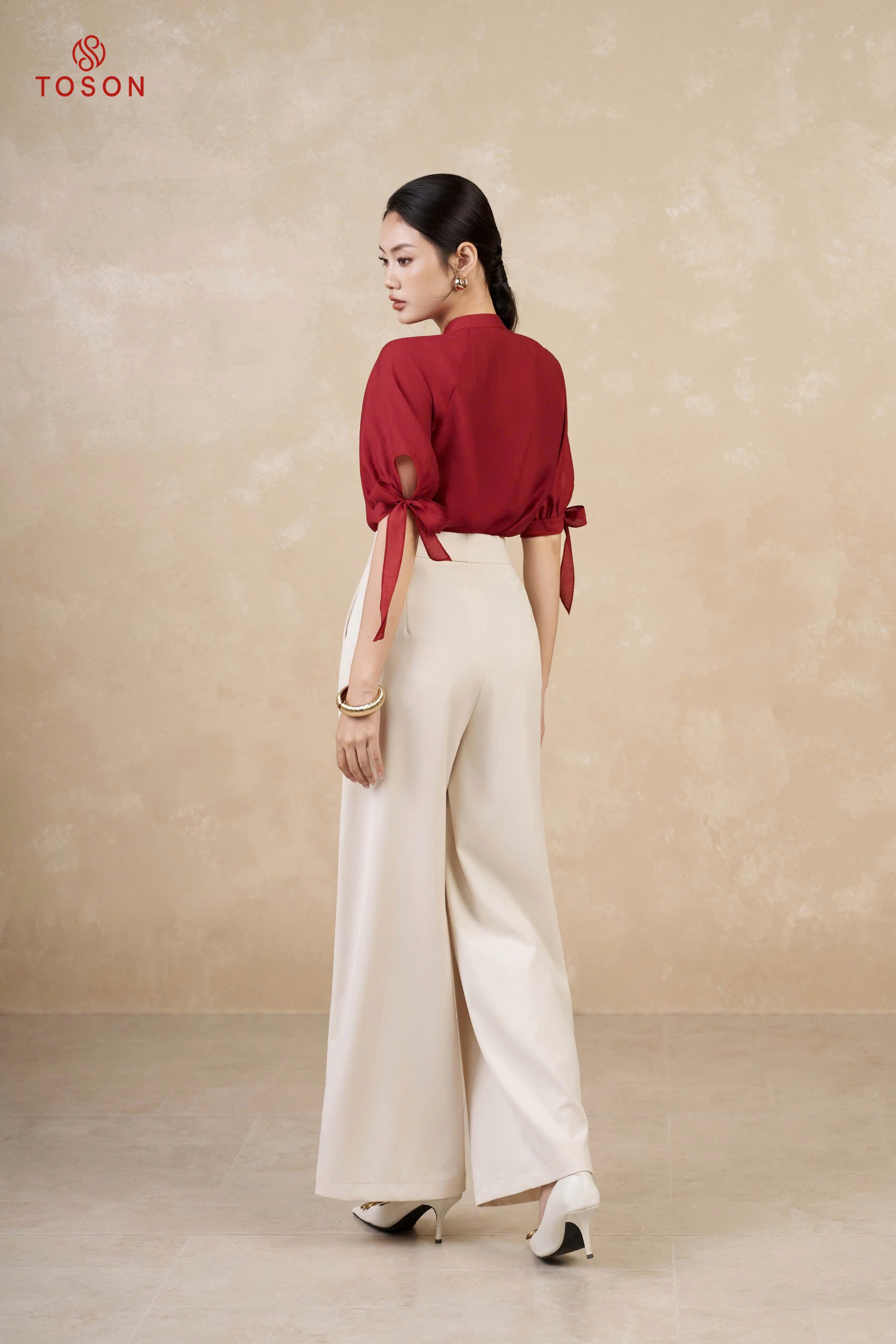 12045D35 - Áo silk đỏ dài tay cổ buộc nơ
