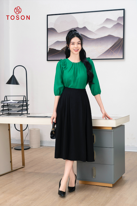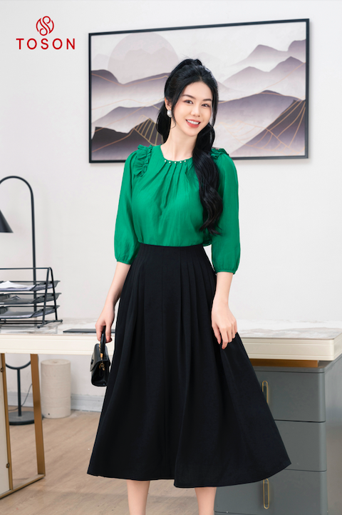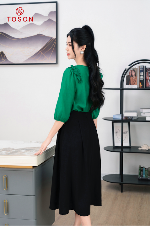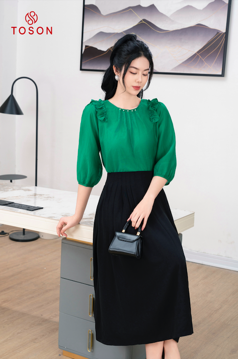 14068X84 - Áo tơ xanh tay lỡ, vai xếp bèo