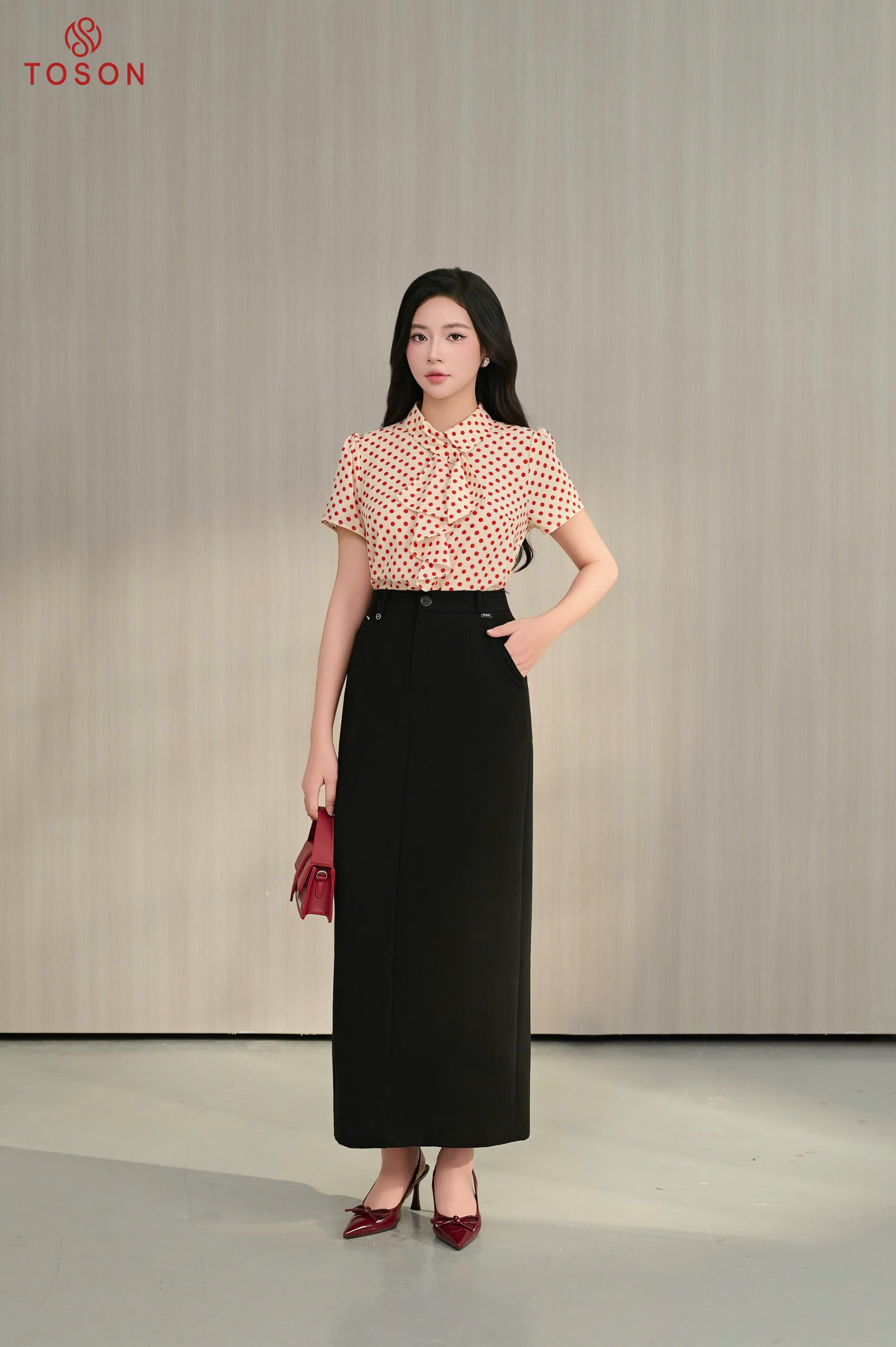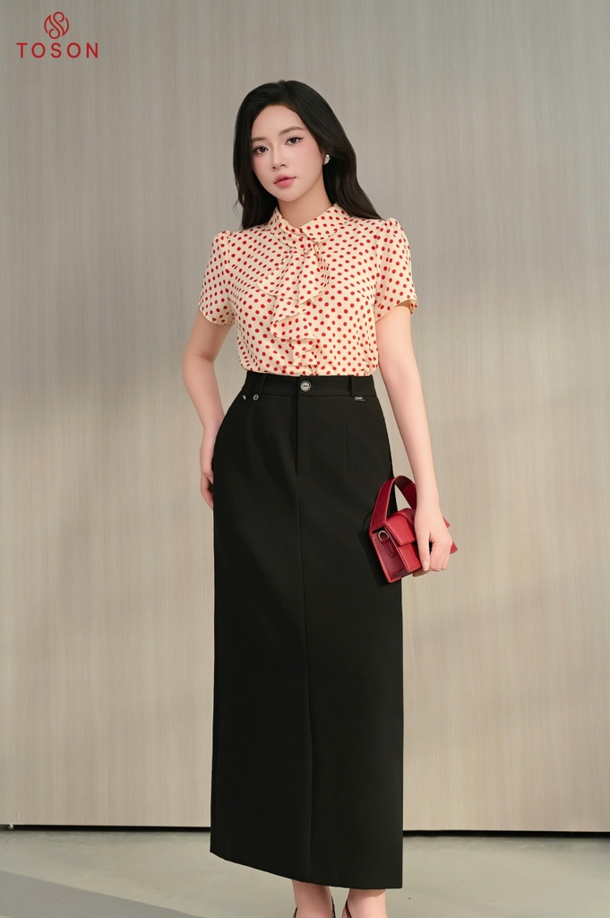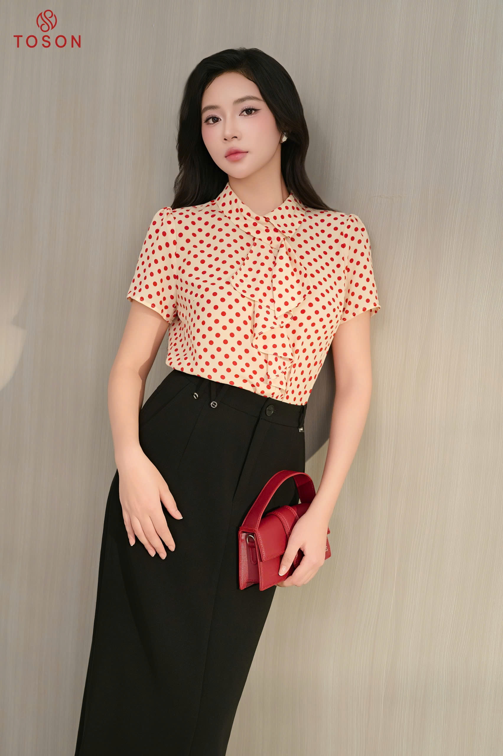 14087J65 - Áo cổ nơ lụa hồng chấm bi đỏ