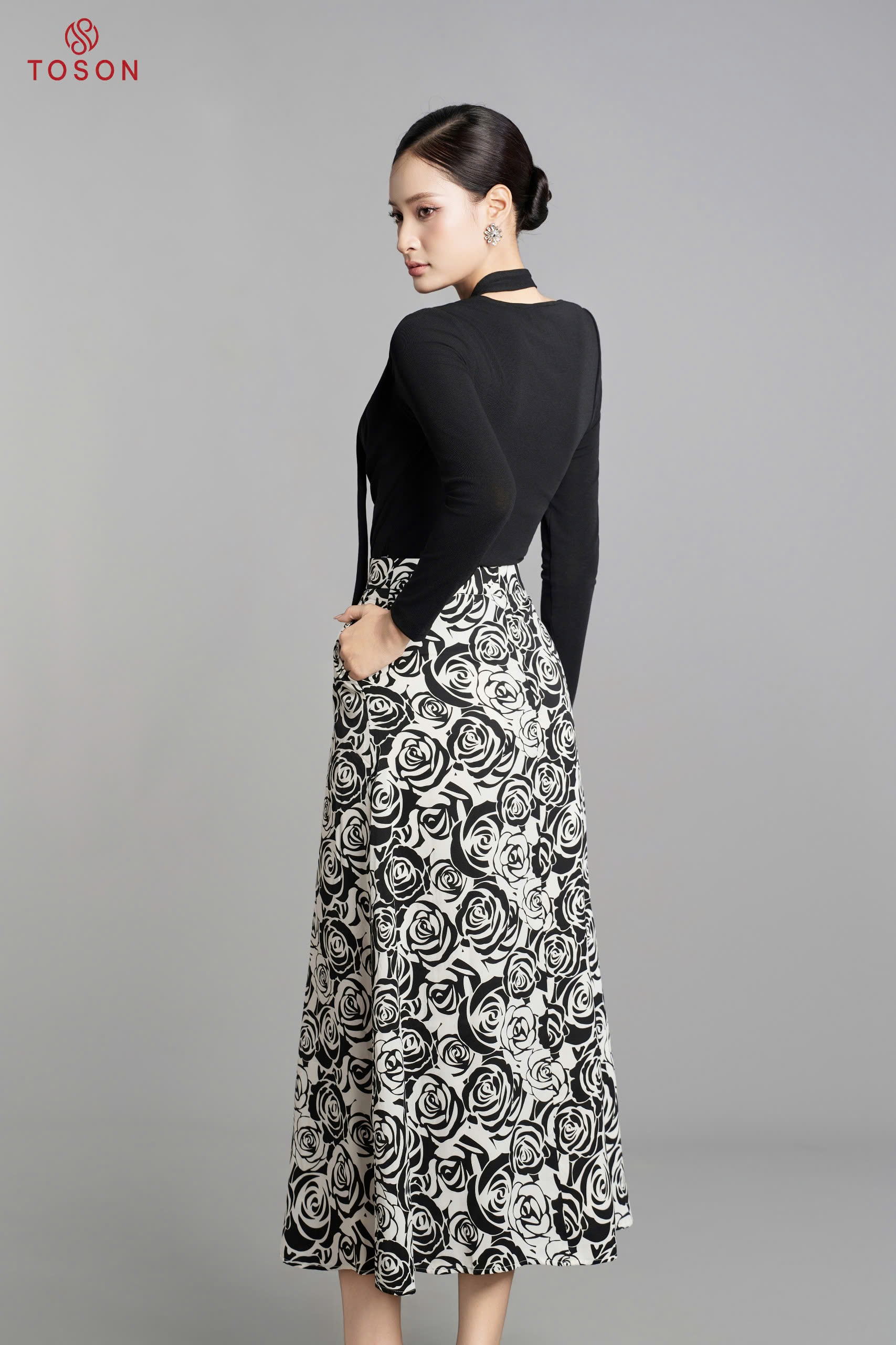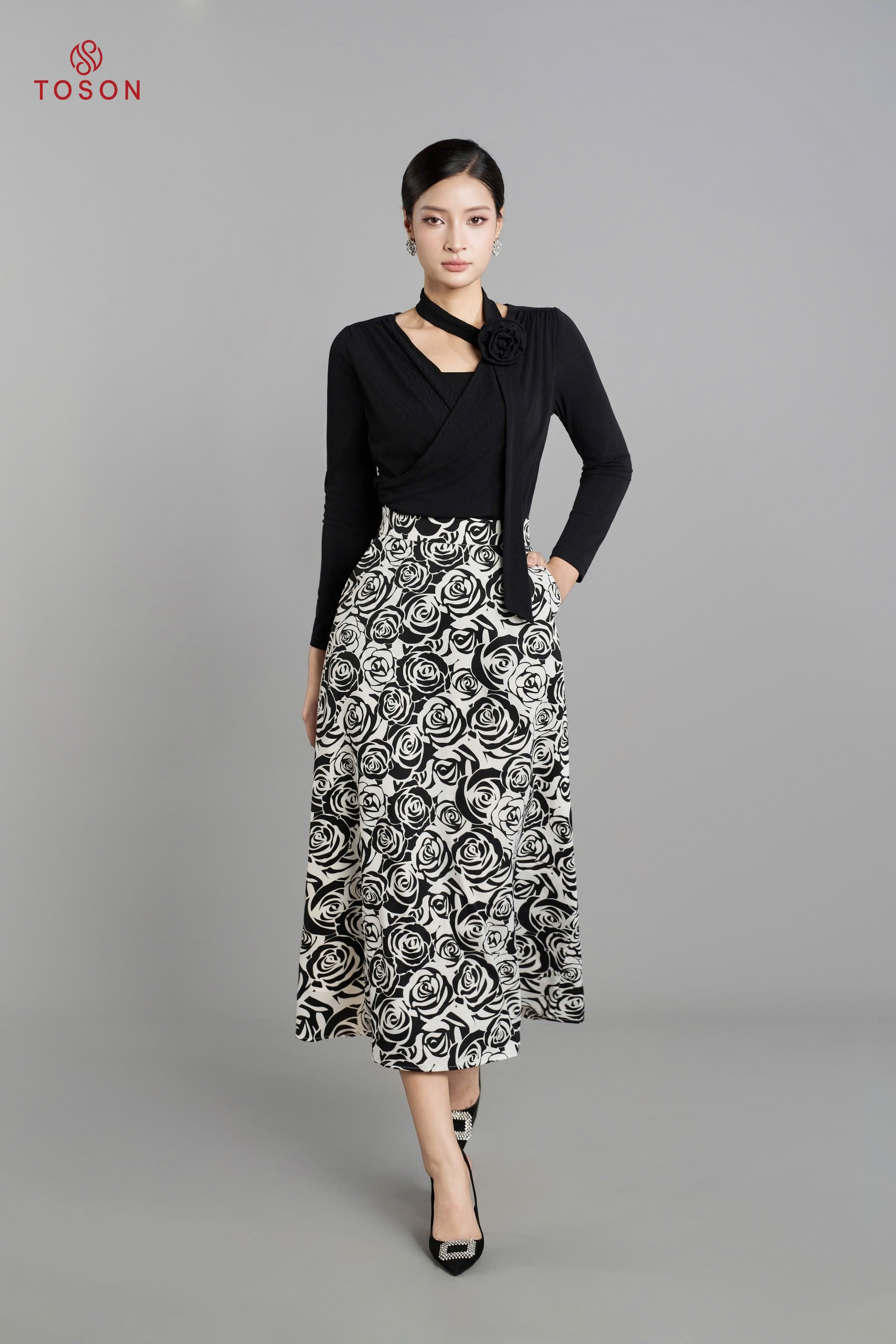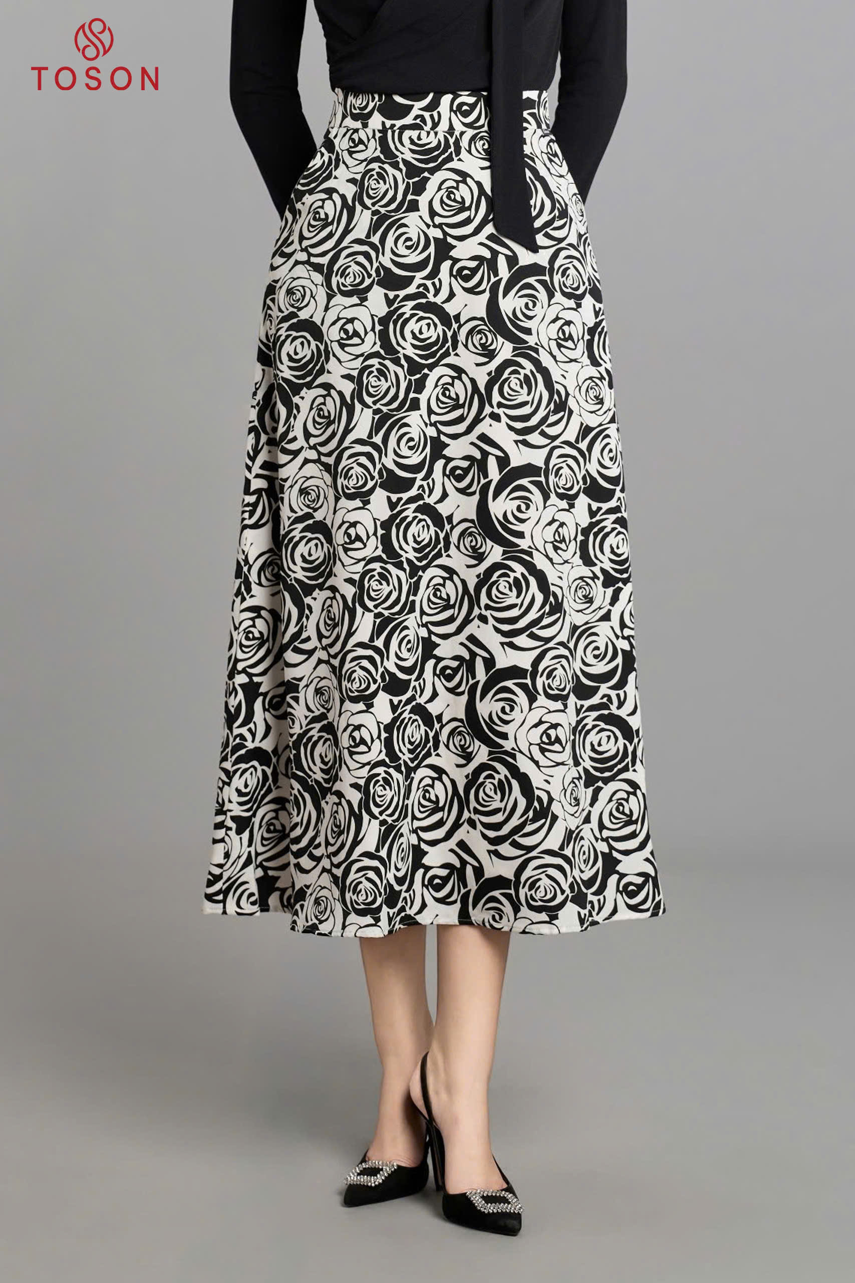 33037H65 - Chân váy xoè lụa hoa hồng túi chéo