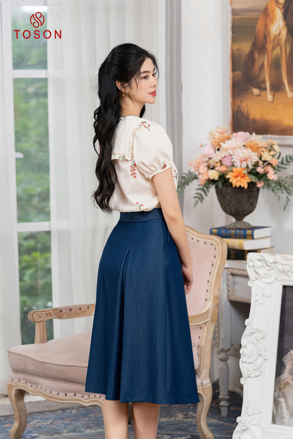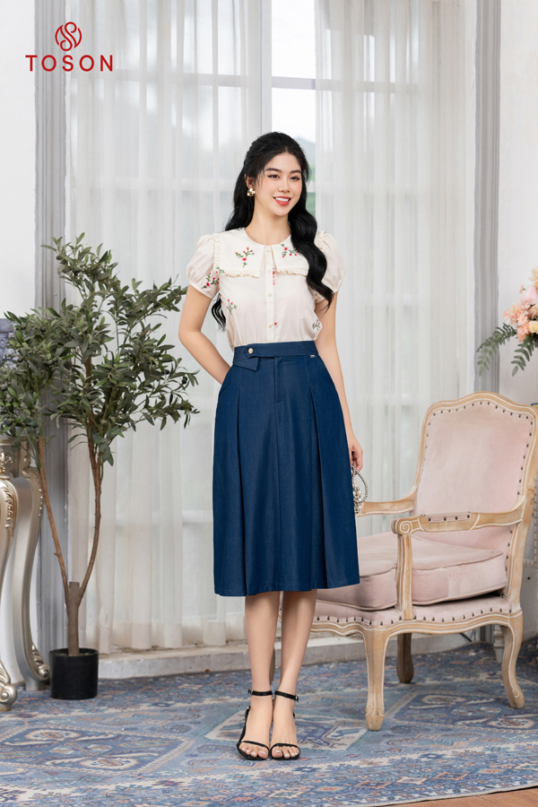 34019X83 - Chân váy tuýp si xanh xếp ly xòe, cạp phối tà bong Limitted.