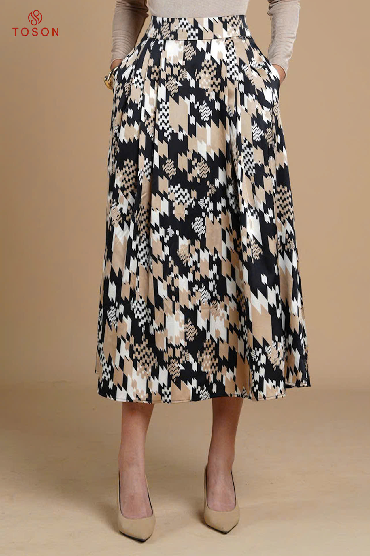 34045K65 - Chân váy xòe lụa kẻ họa tiết