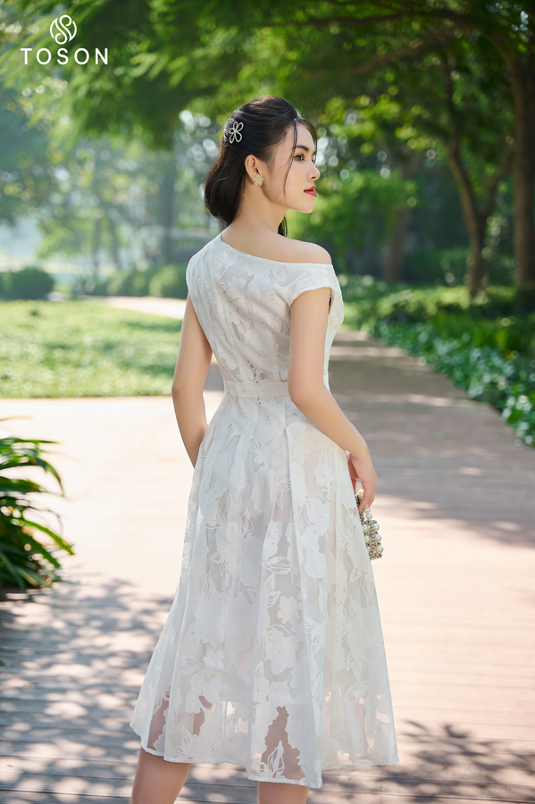 41052W33 - Đầm organza họa tiết hoa trắng, dáng xòe lệch vai..