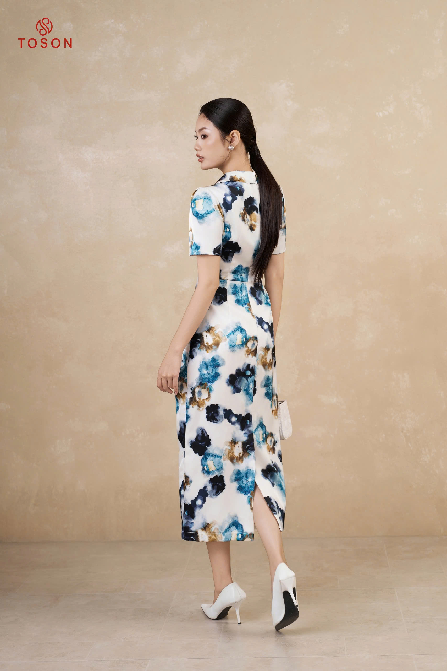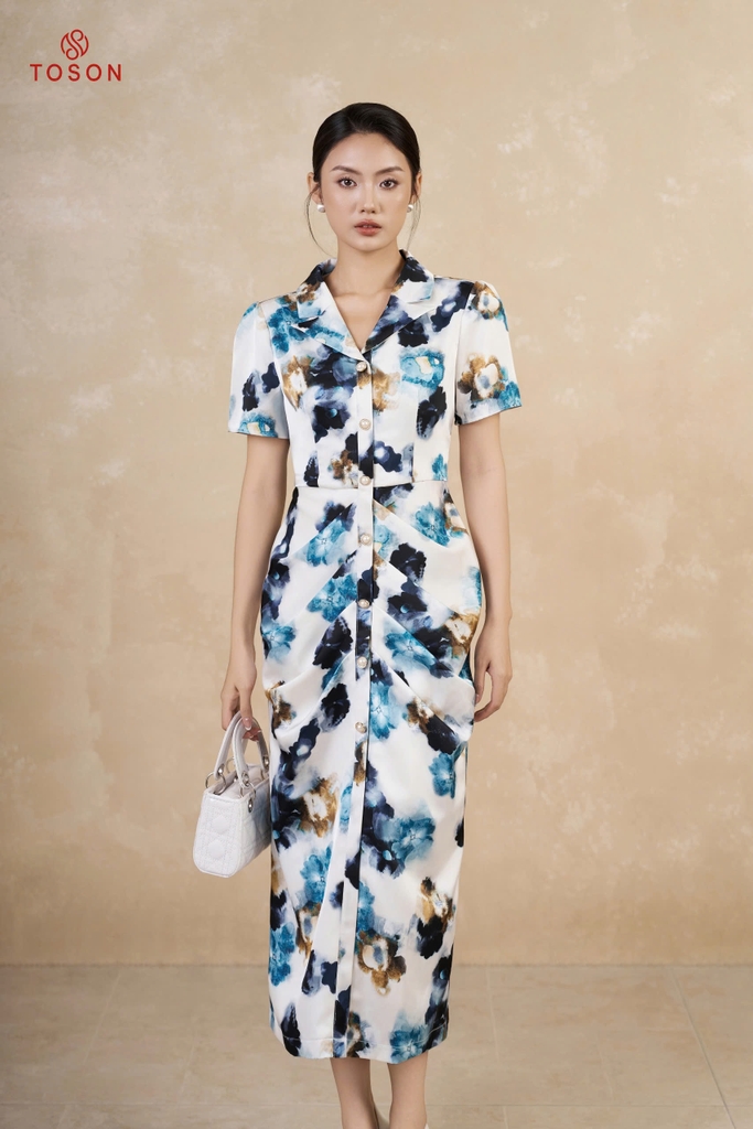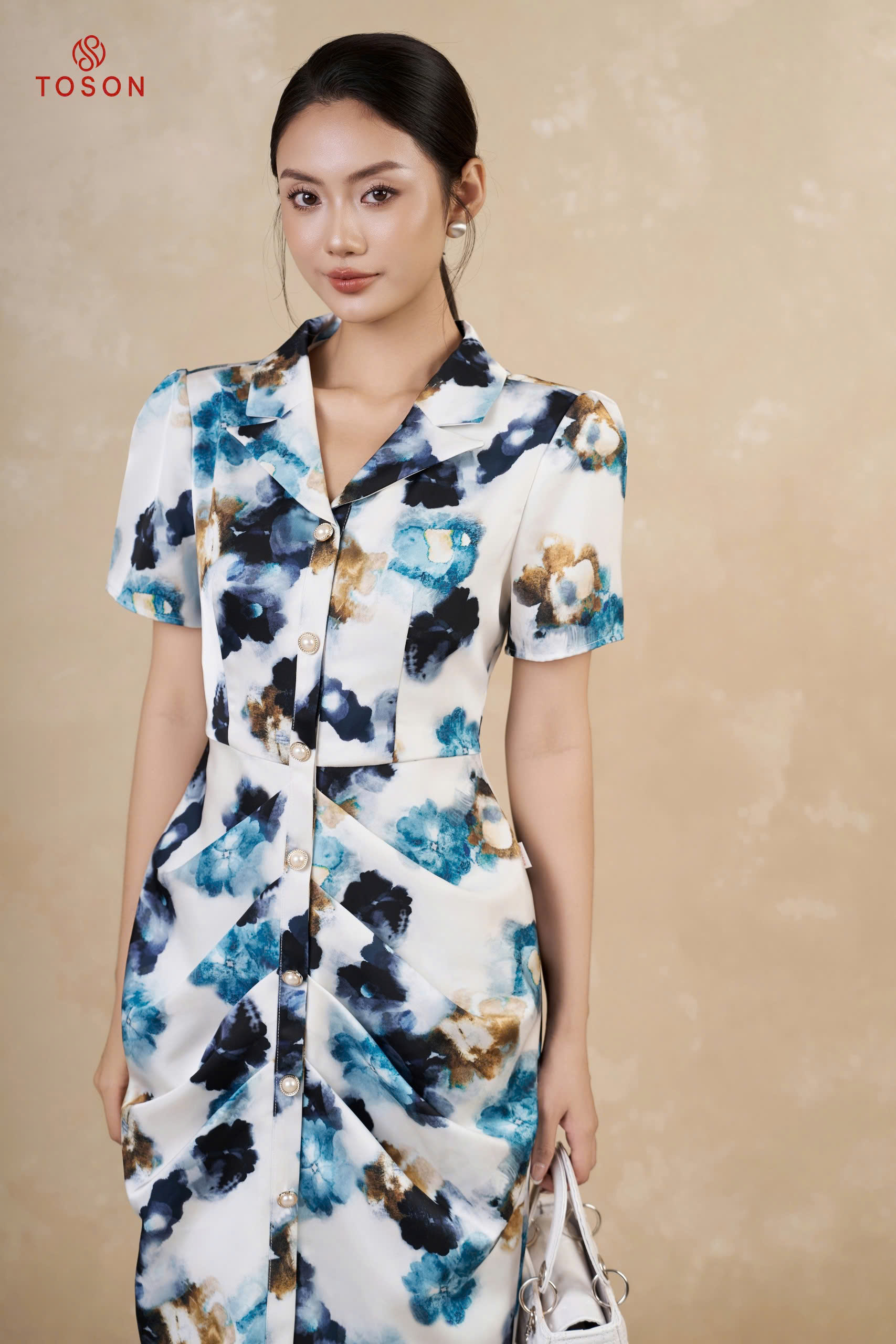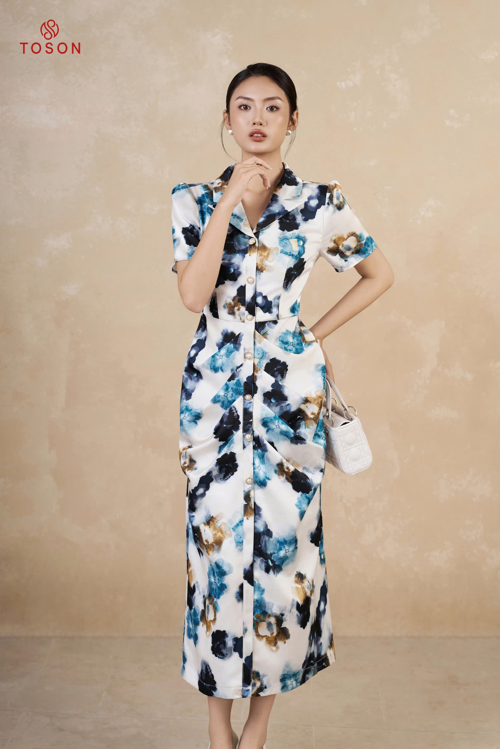 41095H85 - Đầm lụa hoa đen xếp ly thân trước