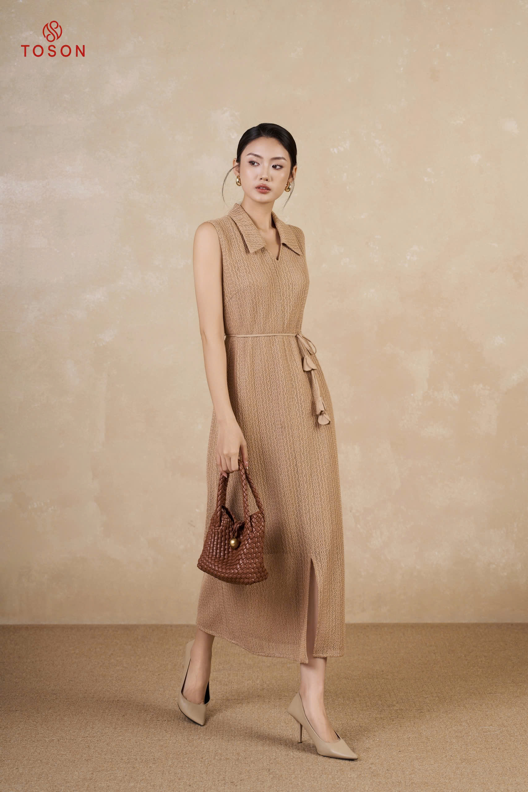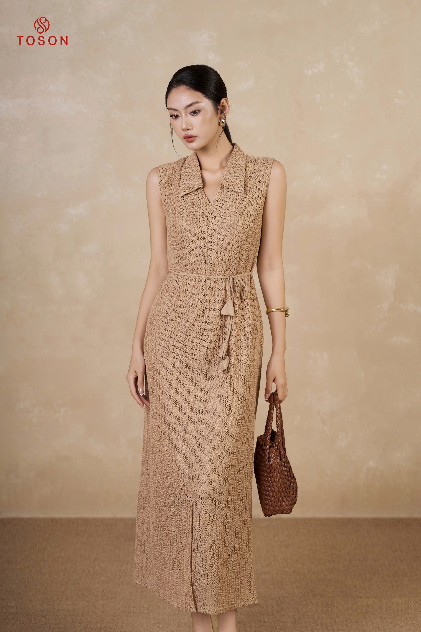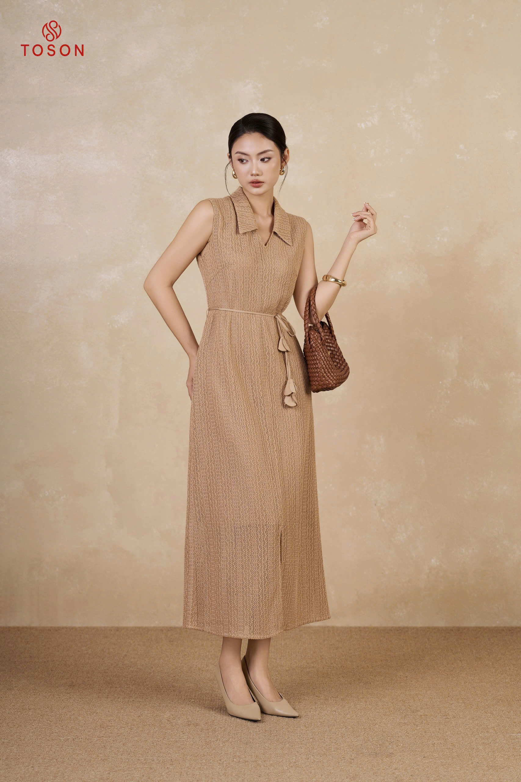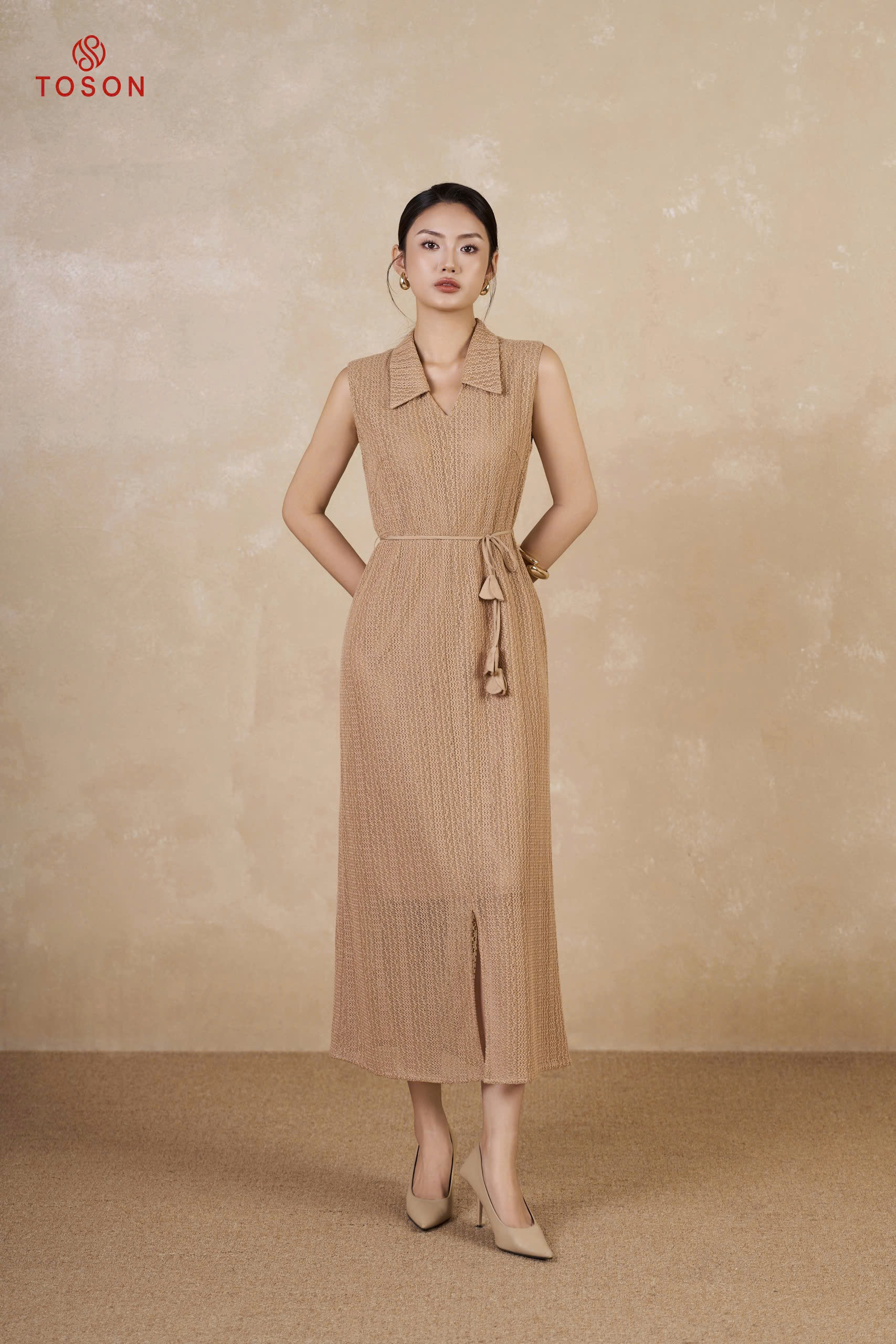 42063N95 - Đầm ren sợi nâu, thắt đai eo