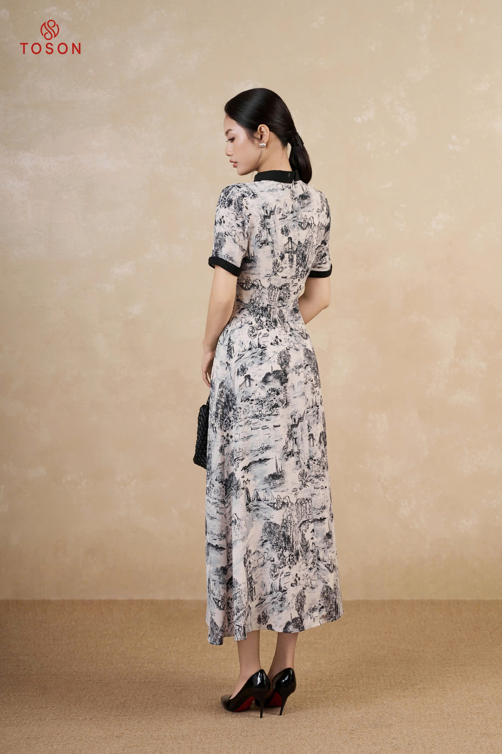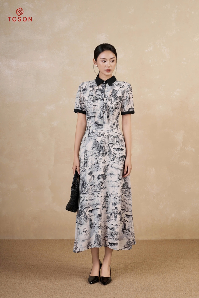 43084 - Đầm xòe lụa silk họa tiết hoa đen