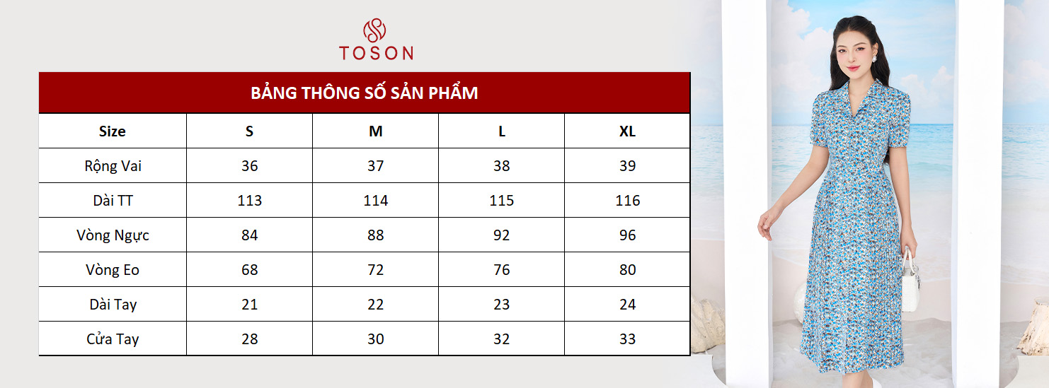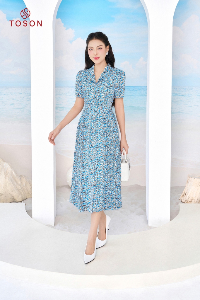 44025H94 - Đầm thô lụa hoa xanh, cổ đức xếp ly 2 bên