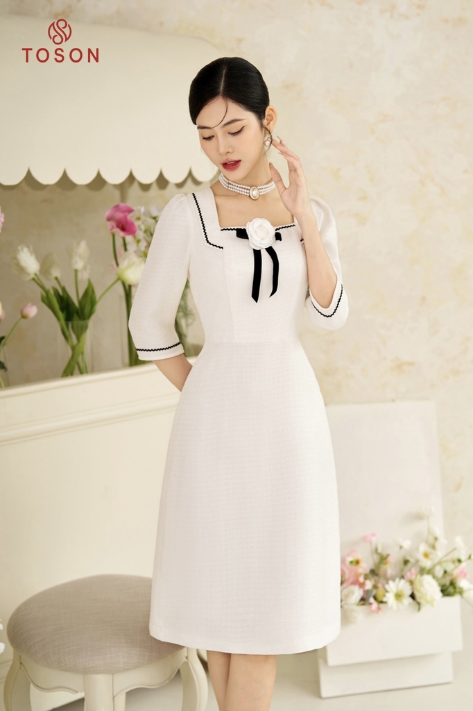 46874W94 - Đầm tweet trắng dáng A, cổ đính nơ hoa
