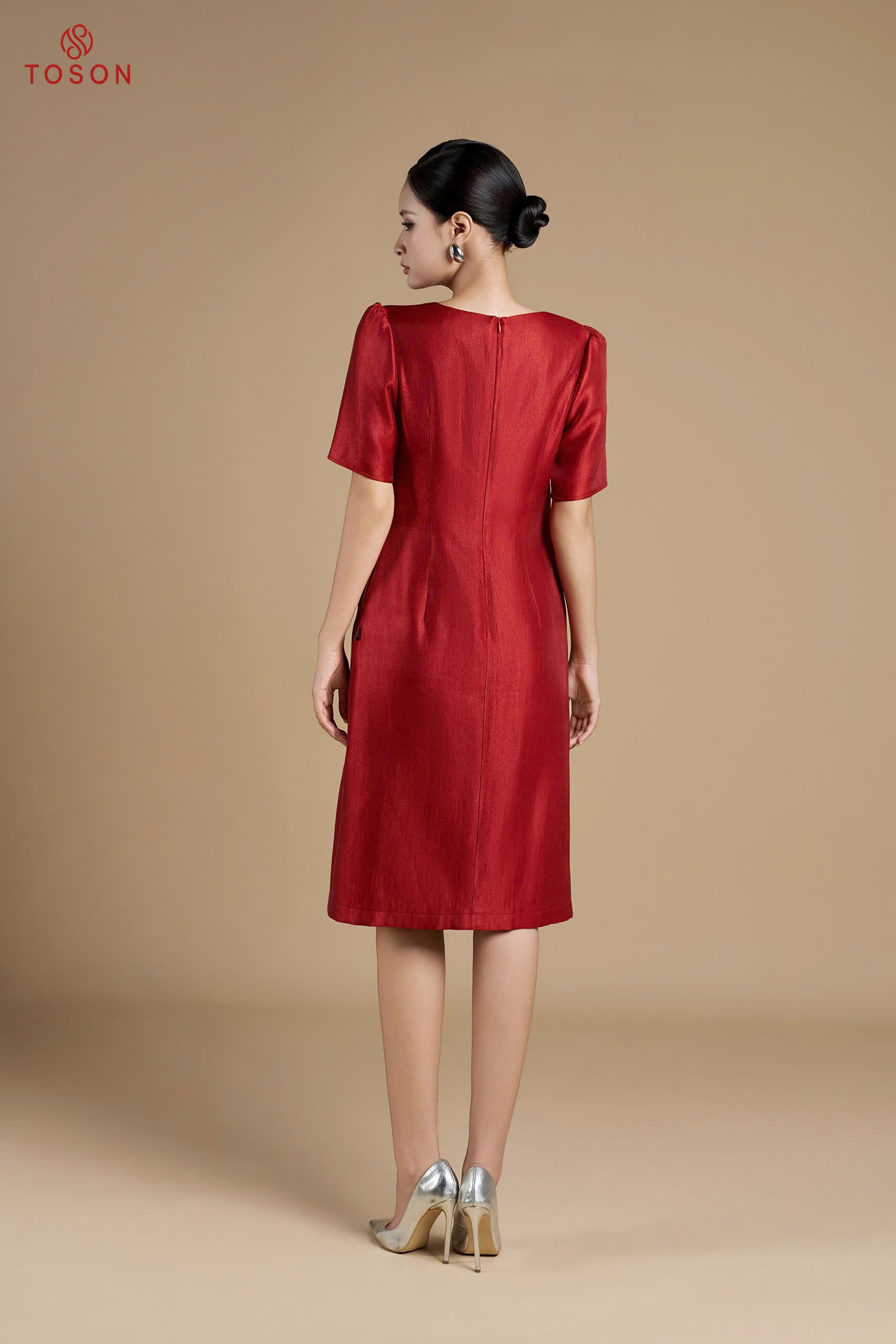49101D95 - Đầm đỏ sake cổ đính cườm, vai xếp ly