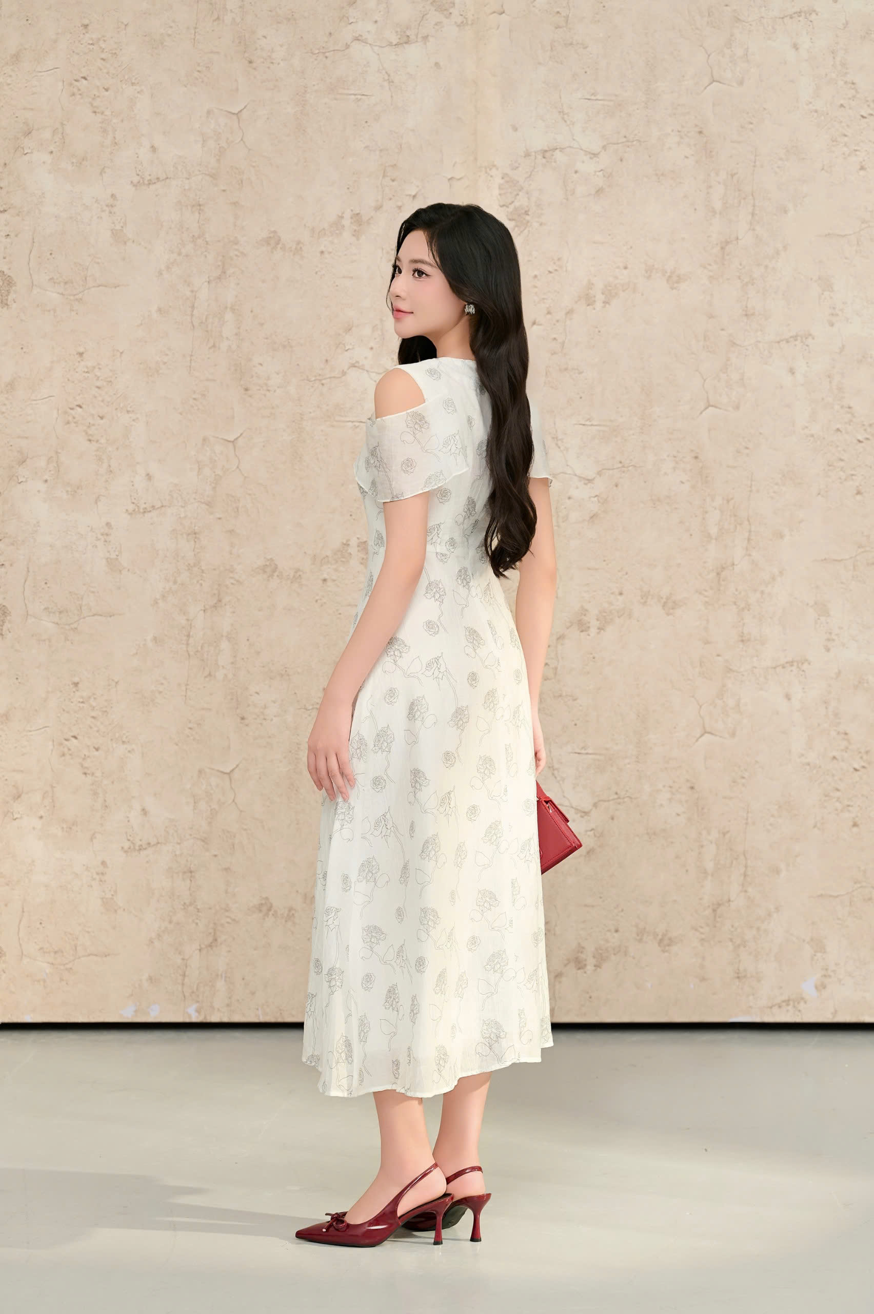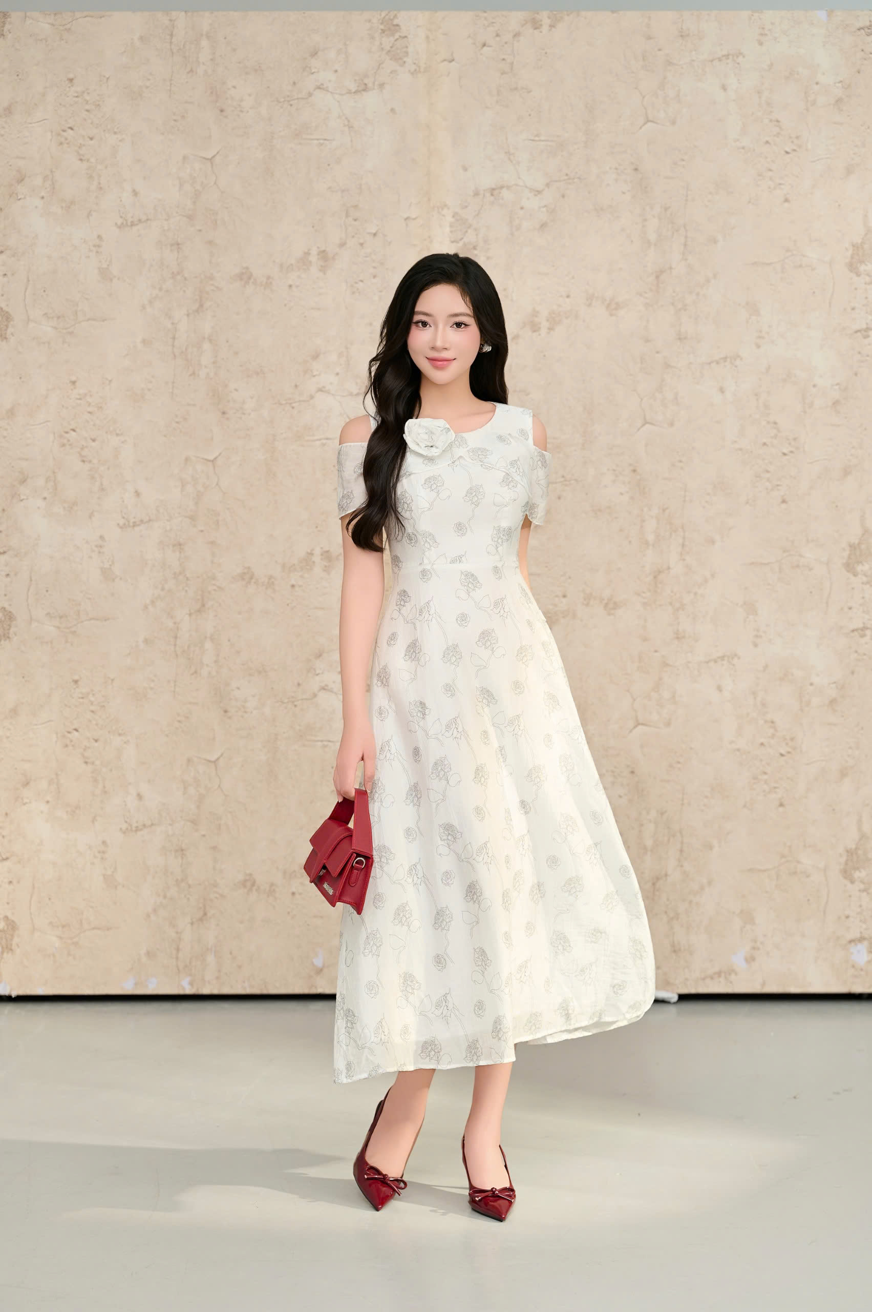 44066W65 - Đầm tơ trắng kem in hoa hồng xếp nhún