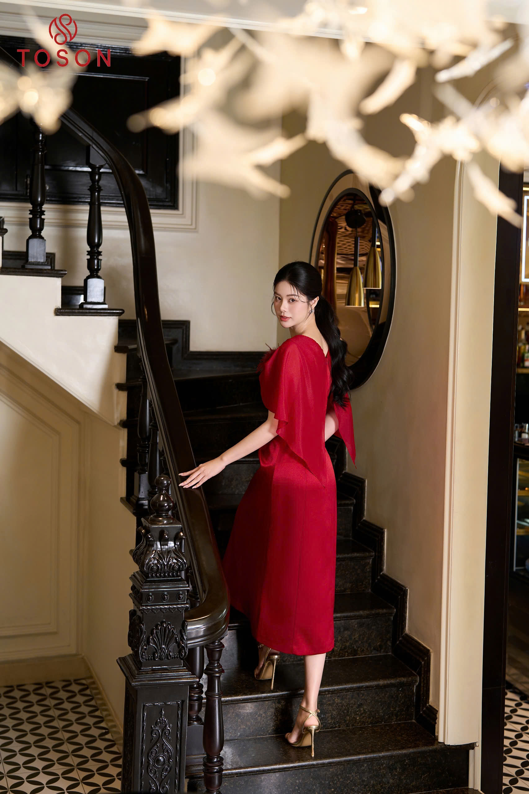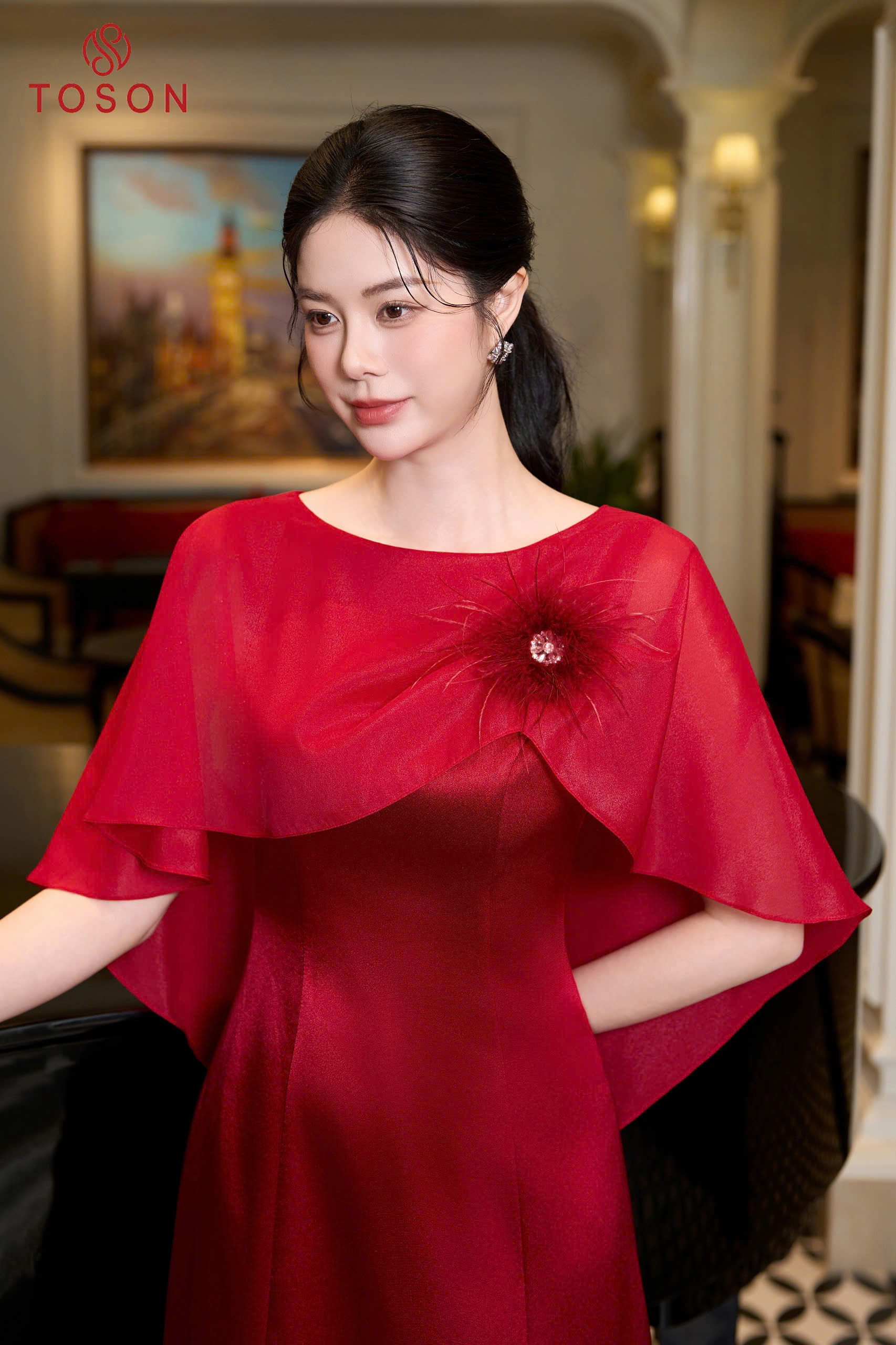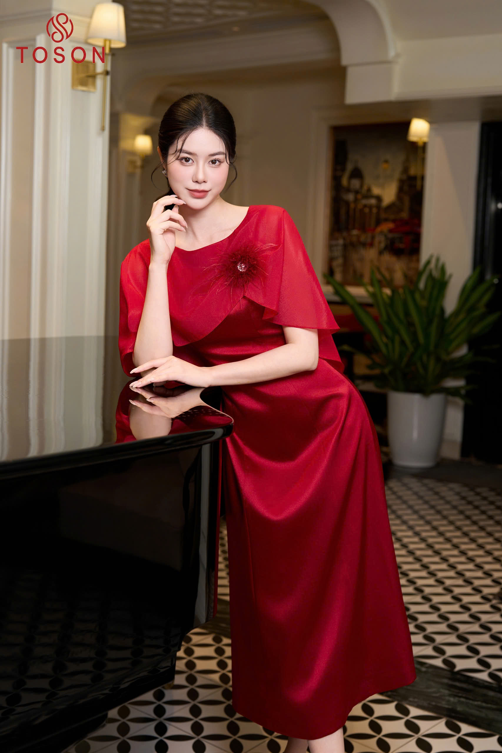 49122D96 - Đầm tiệc lụa đỏ vai phối tà bong