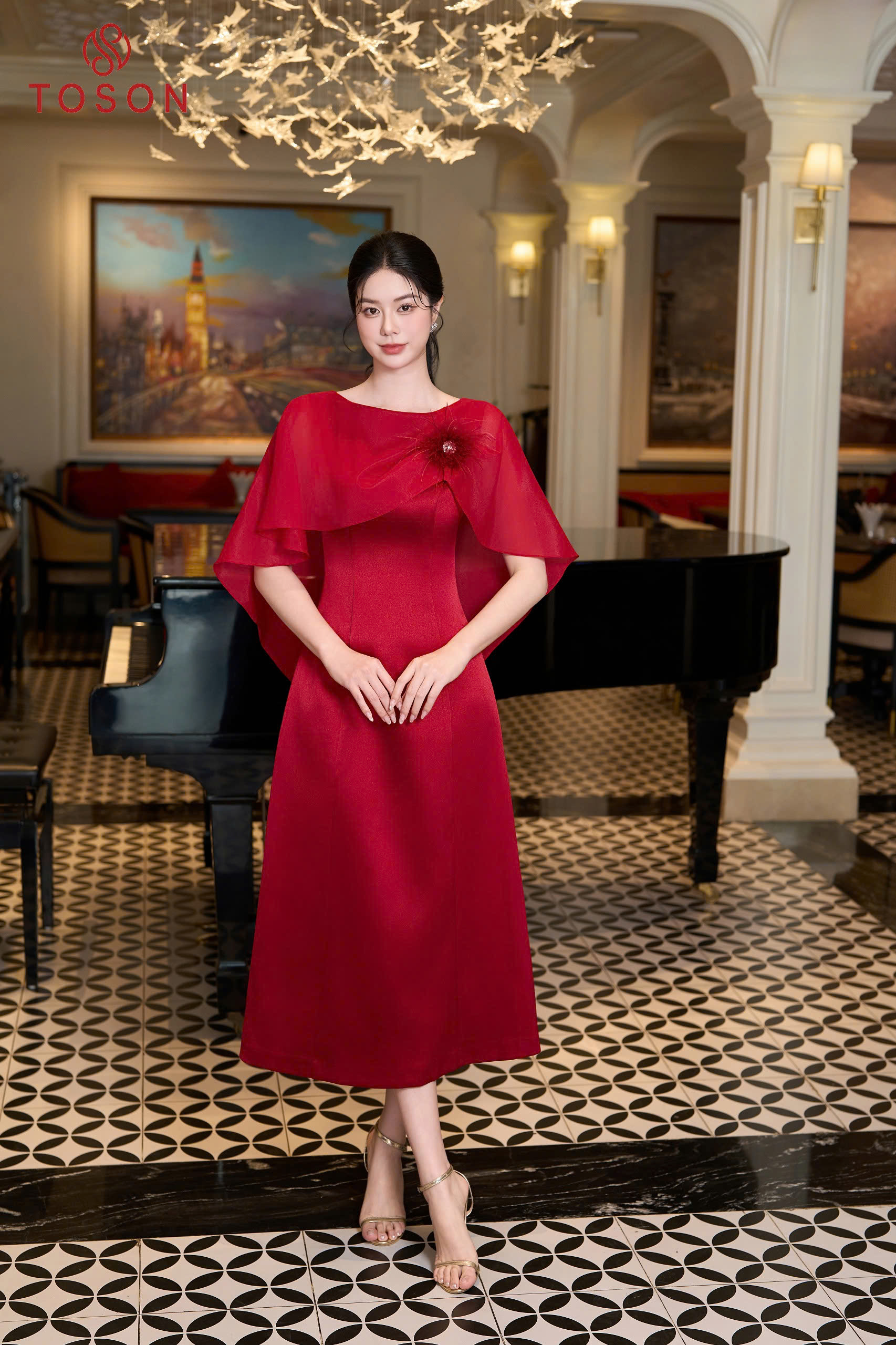 49150D96 - Đầm tiệc gấm đỏ hoa trang trí