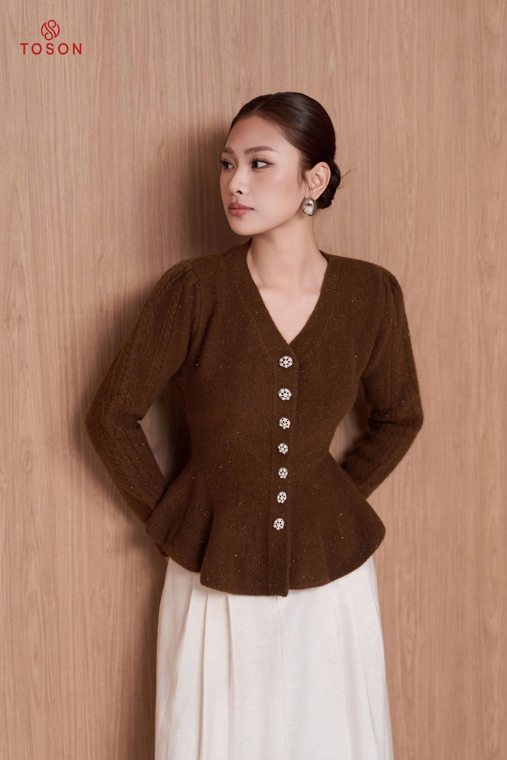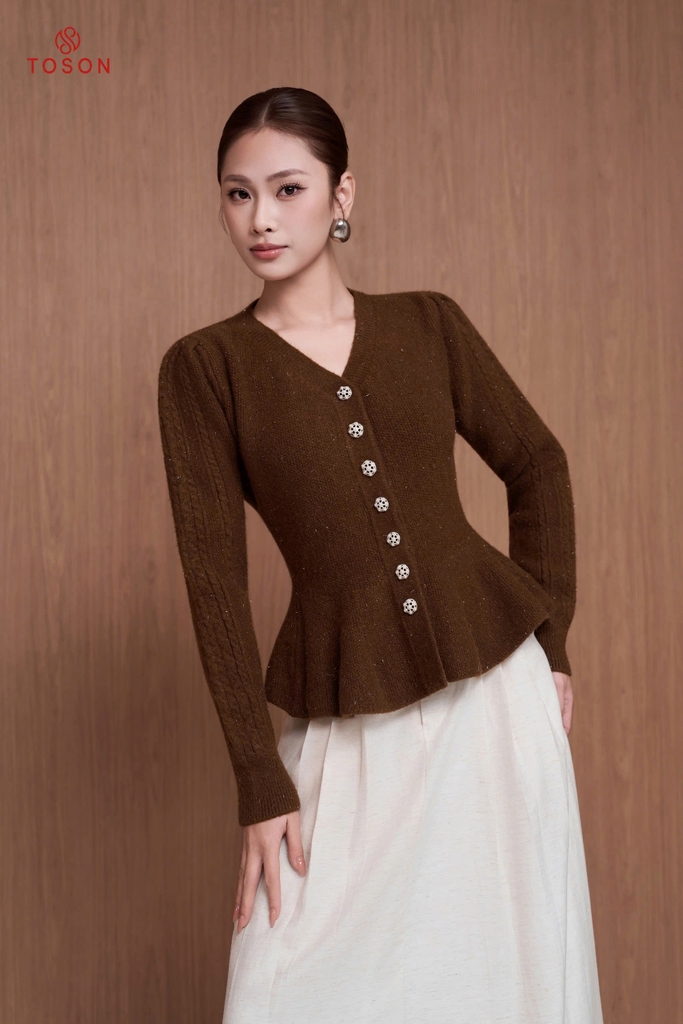 60003 - Áo len nâu dáng xòe cổ tim đính cúc