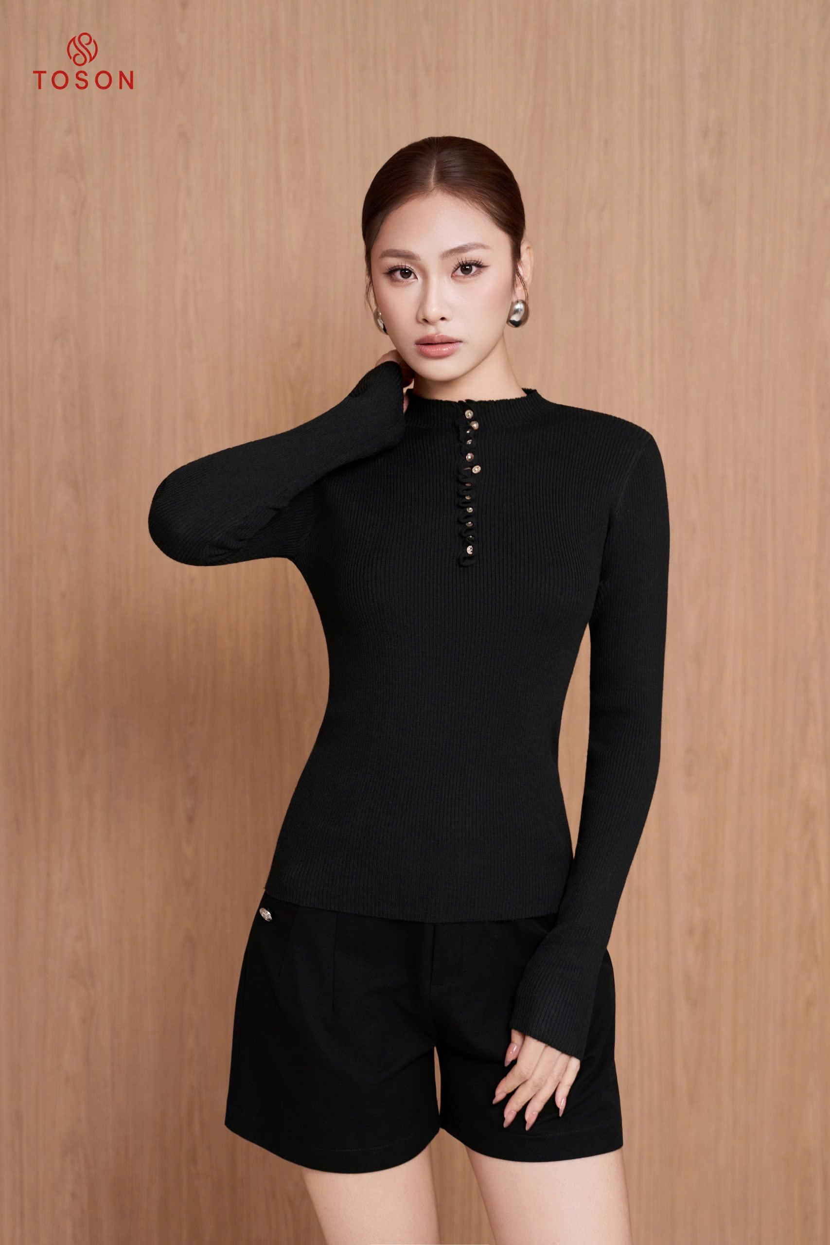 60004 - Áo len ôm cổ xếp nhún đính cúc