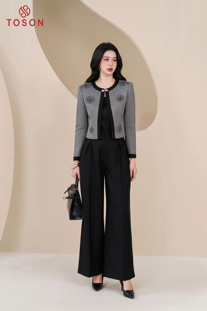 82005G95 - Áo vest ngắn dạ len ghi thêu hoa hồng