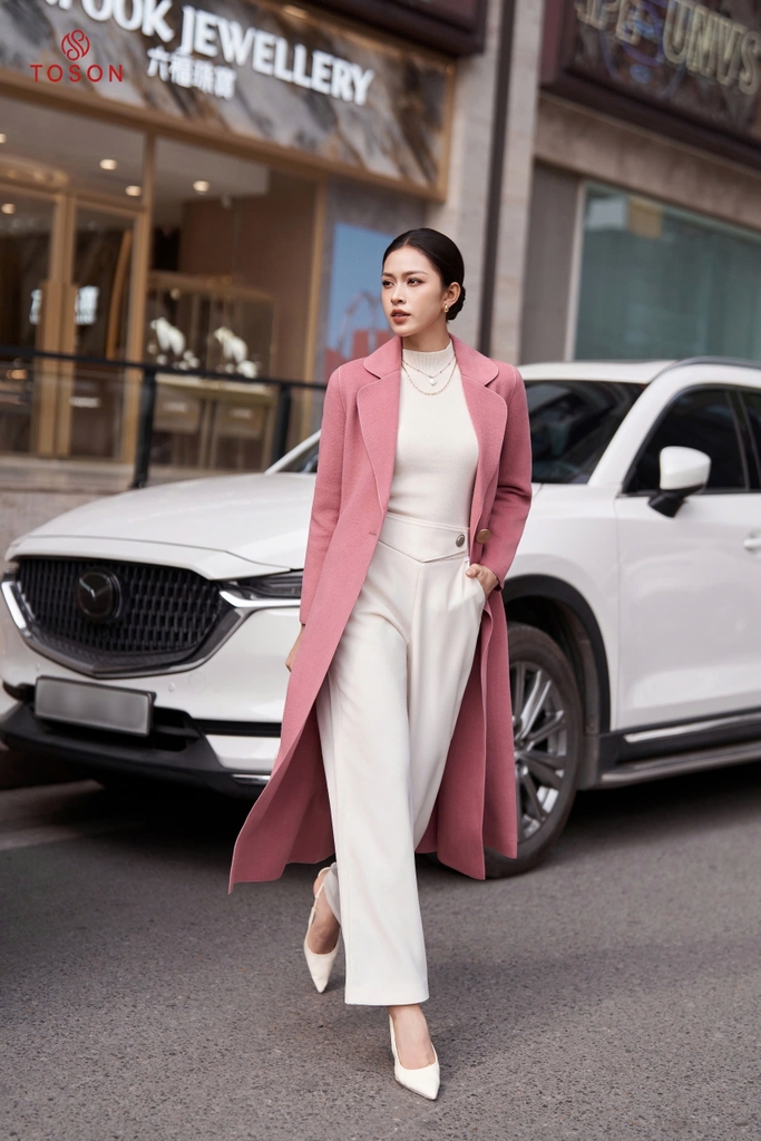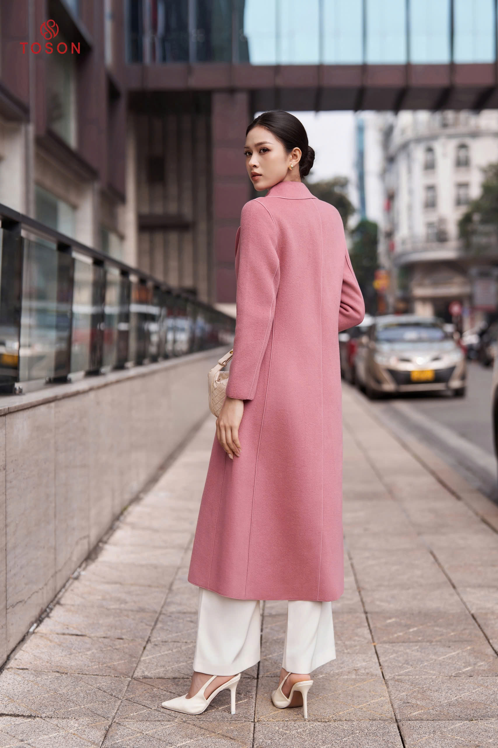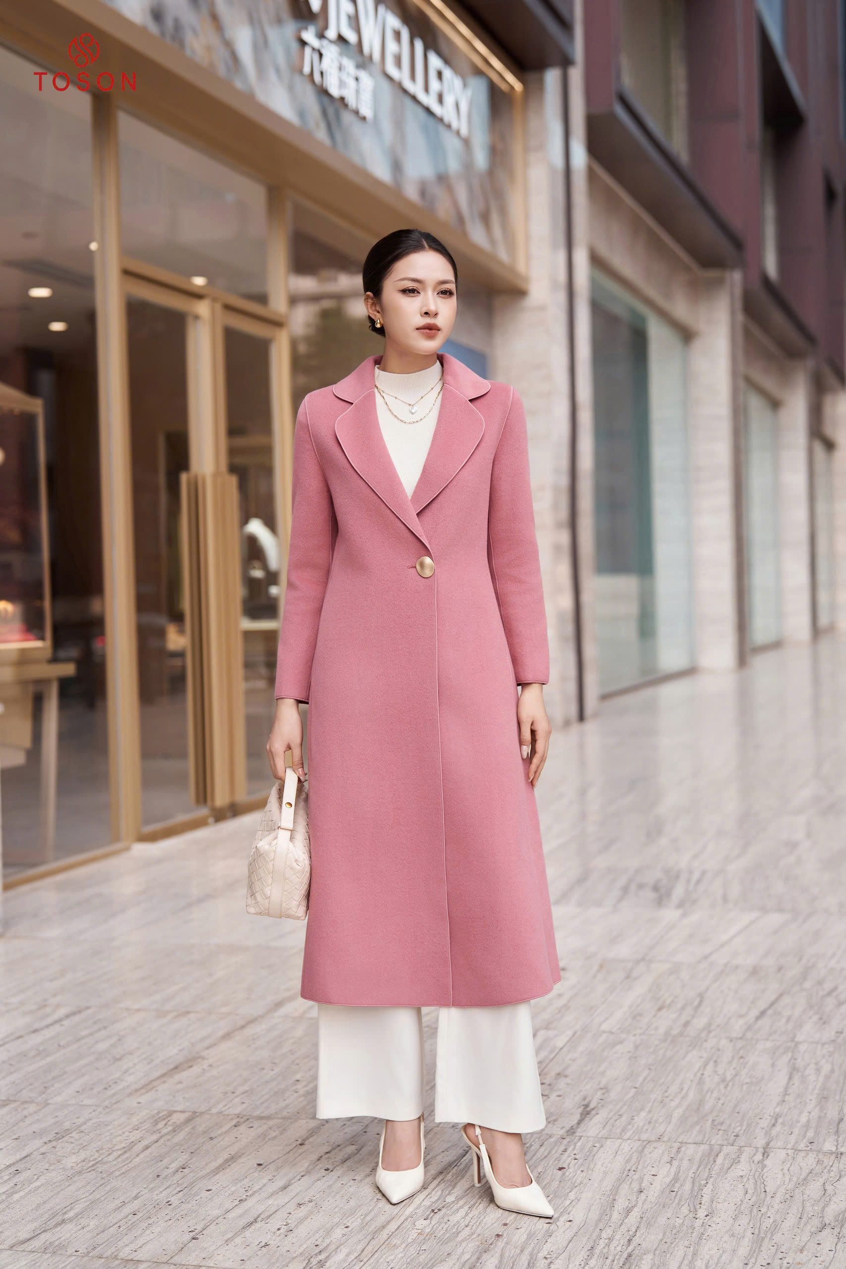 99002D34 - Áo dạ lông cừu đỏ, dáng dài, mí gân cửa tay đính trang trí