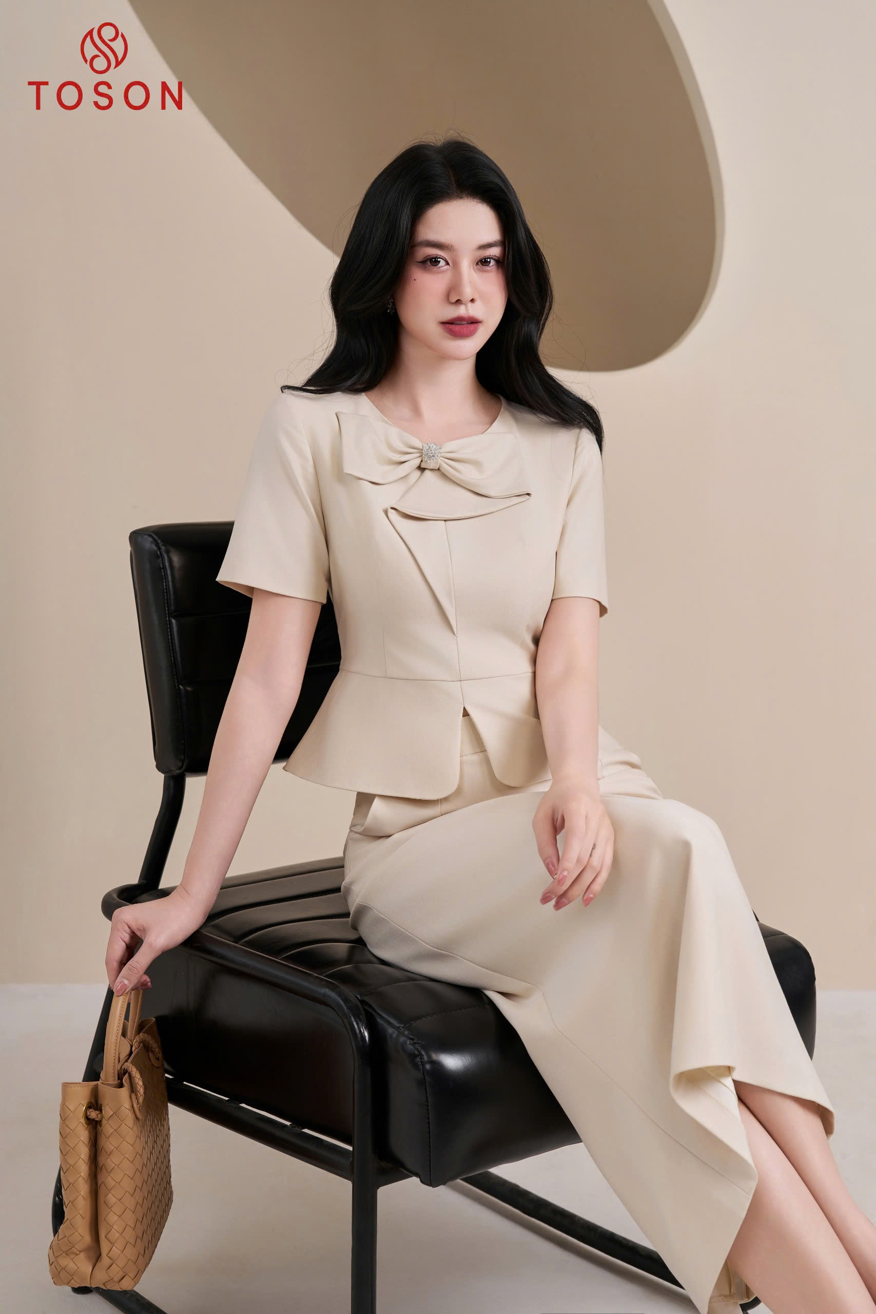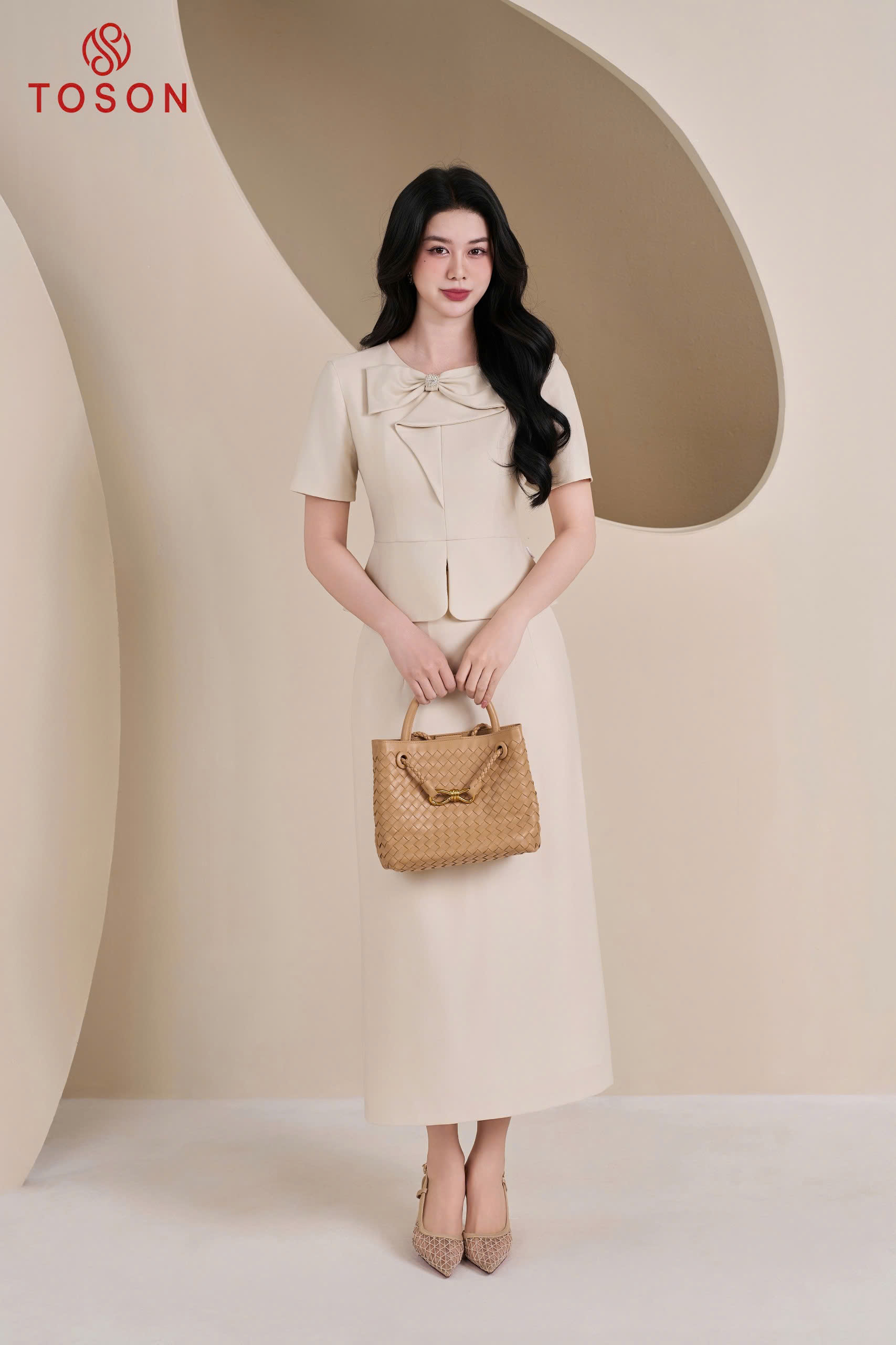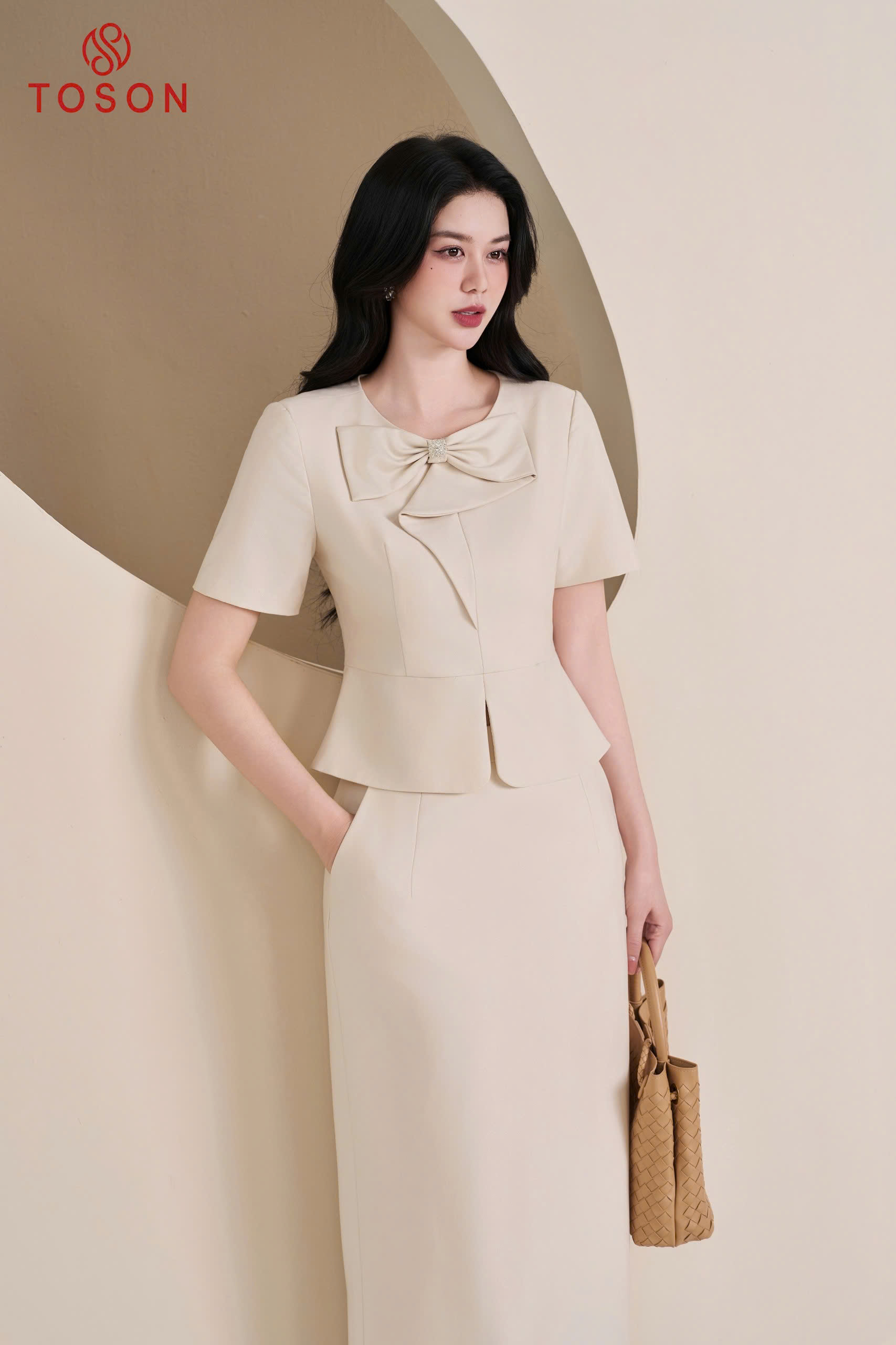 B1309E65 - Bộ ký giả kem: Áo cổ nơ + C.Váy