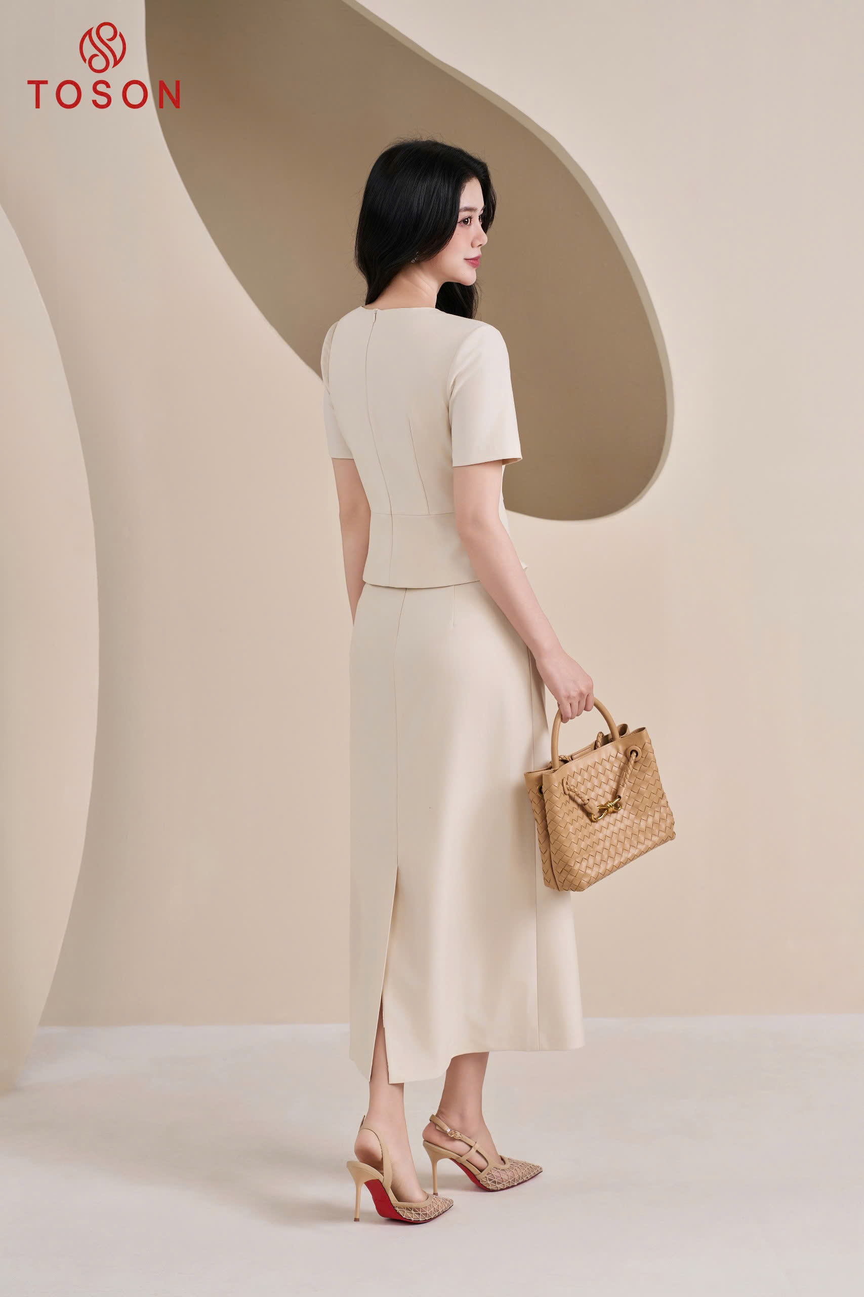 B1393E95 - Bộ kem gấm: Áo peplump tay bồng + C.váy (SXTN)