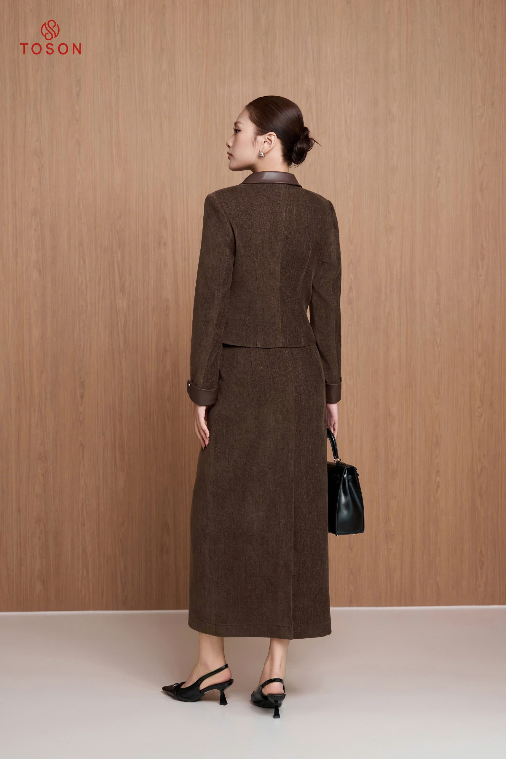 B8364N65 - Bộ nhung nâu phối da: Vest + C.váy