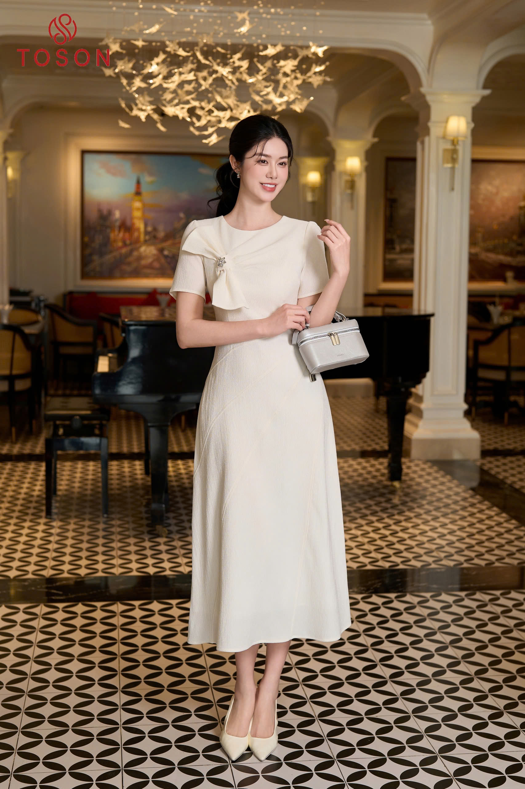 Không dừng lại ở tính thẩm mỹ, đầm cổ đức dáng A còn là “trợ thủ” tôn dáng tinh tế: chiết eo vừa đủ để định hình đường cong, phần thân dưới buông rơi tự nhiên giúp che khuyết điểm và tạo hiệu ứng vóc dáng cân đối hơn.
